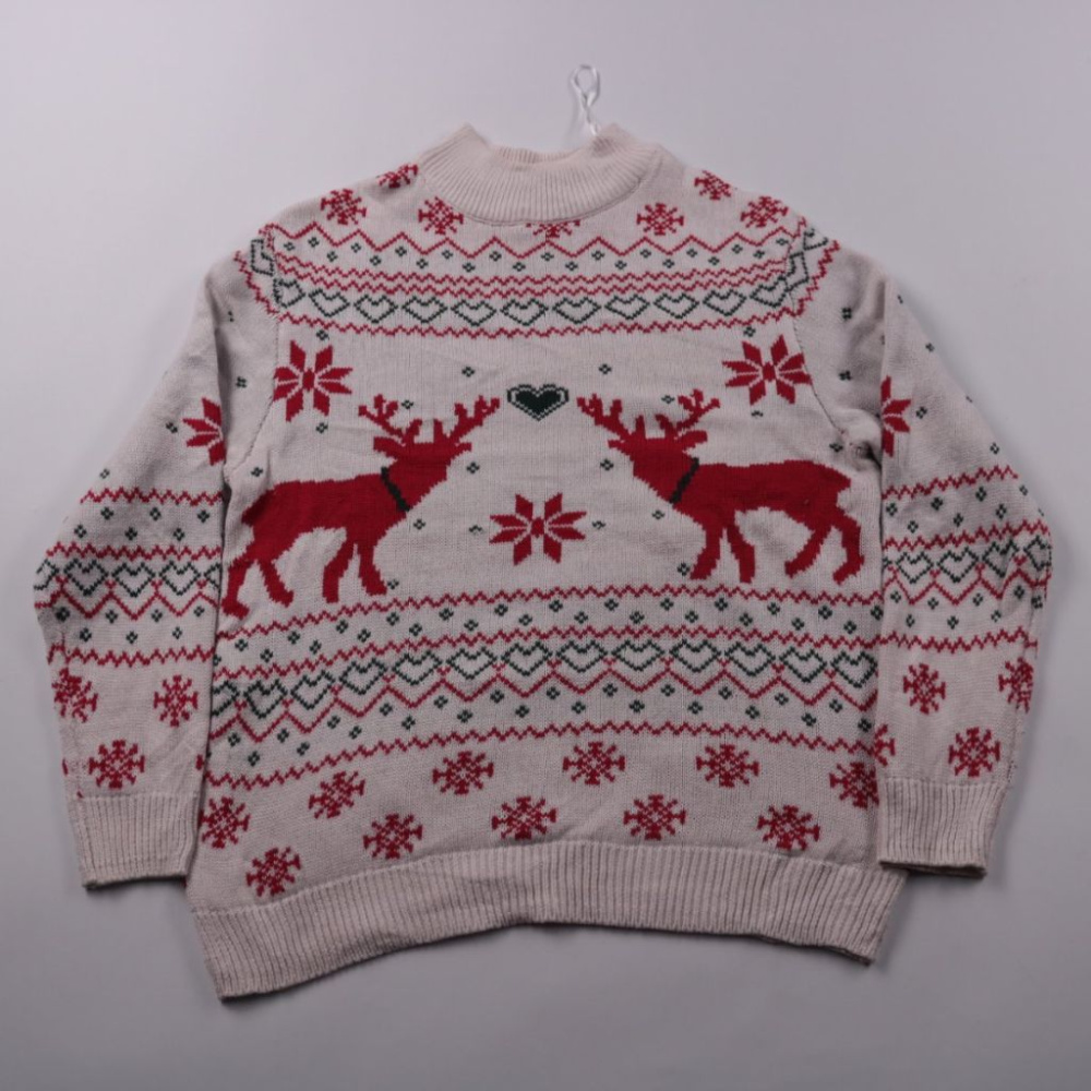Вязаный свитер Bpc (bonprix collection) молочного цвета с зимним жаккардовым рисунком: олени, снежинки и орнамент. Подойдёт для тёплых повседневных образов и новогодних/зимних мероприятий. Практичный плюс — мягкая смесовая пряжа (хлопок/акрил) и просто...