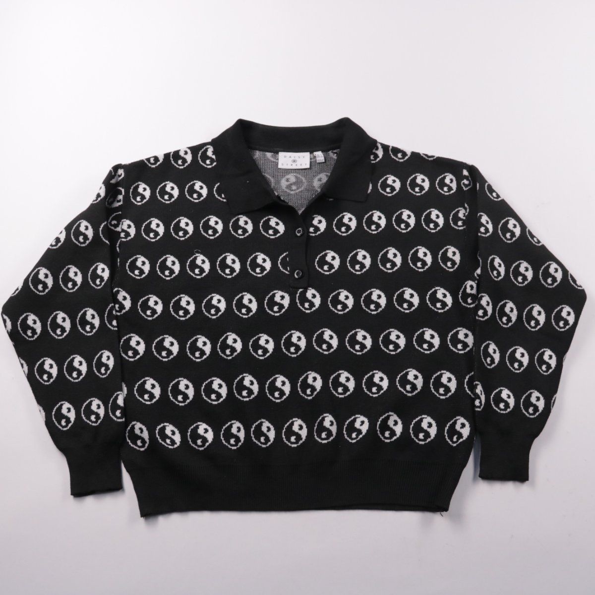 Джемпер-поло Daisy Street чёрного цвета с контрастным узором инь-ян по всей поверхности. Подойдёт для повседневных образов с джинсами или юбкой в прохладную погоду. Практичный синтетический материал почти не мнётся и быстро сохнет.
