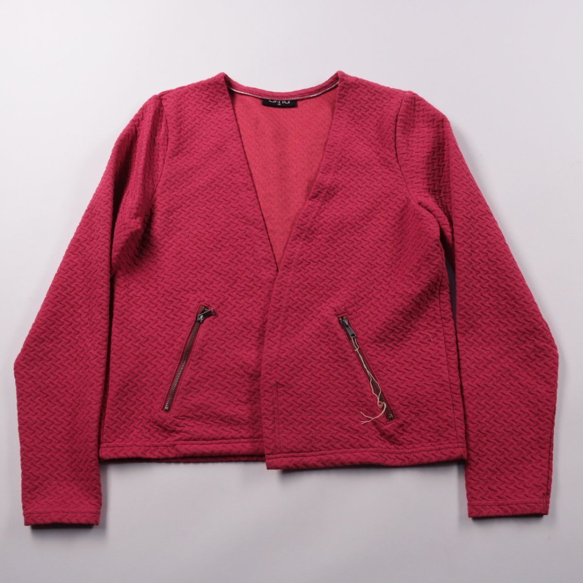 Кардиган Gina бордового цвета с фактурным трикотажем и V-образным вырезом. Подойдёт для офиса и повседневных образов, удобно носить как лёгкий жакет поверх топа или платья. Практичный плюс — карманы на молниях для мелочей.