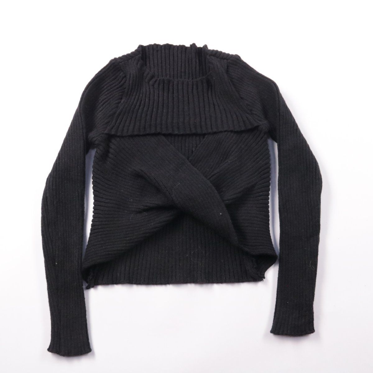 Чёрный женский трикотажный свитер в рубчик с высоким воротником и декоративным перекрутом спереди. Подойдёт для повседневных образов с джинсами или юбкой в прохладную погоду. Эластичный материал хорошо тянется и комфортно садится по фигуре.
