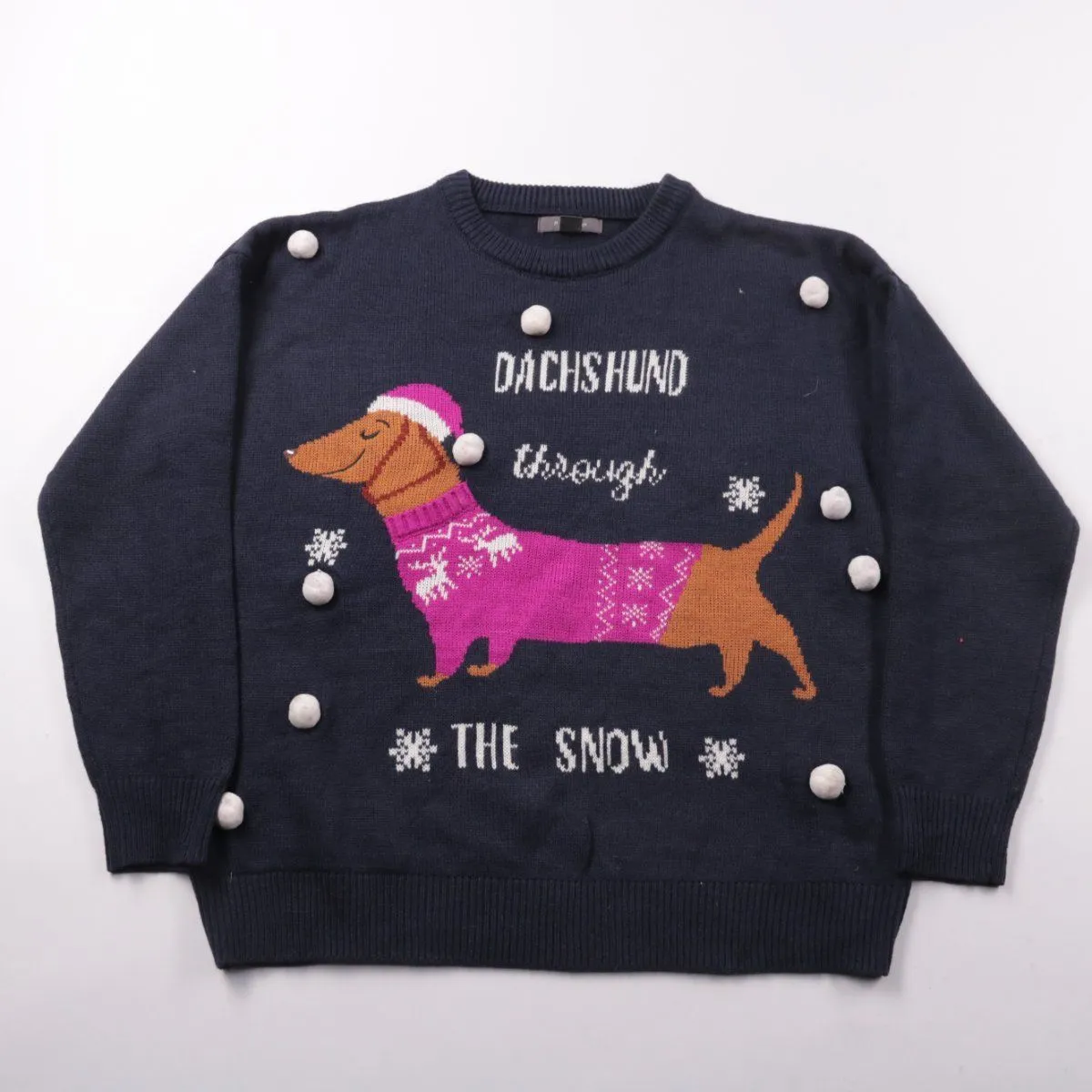 Женский свитер Primark тёмно-синего цвета с новогодним принтом (такса) и объёмными декоративными помпонами. Подойдёт для зимних прогулок, праздников и уютных домашних образов. Практичный плюс — мягкий акрил легко стирается и быстро сохнет.