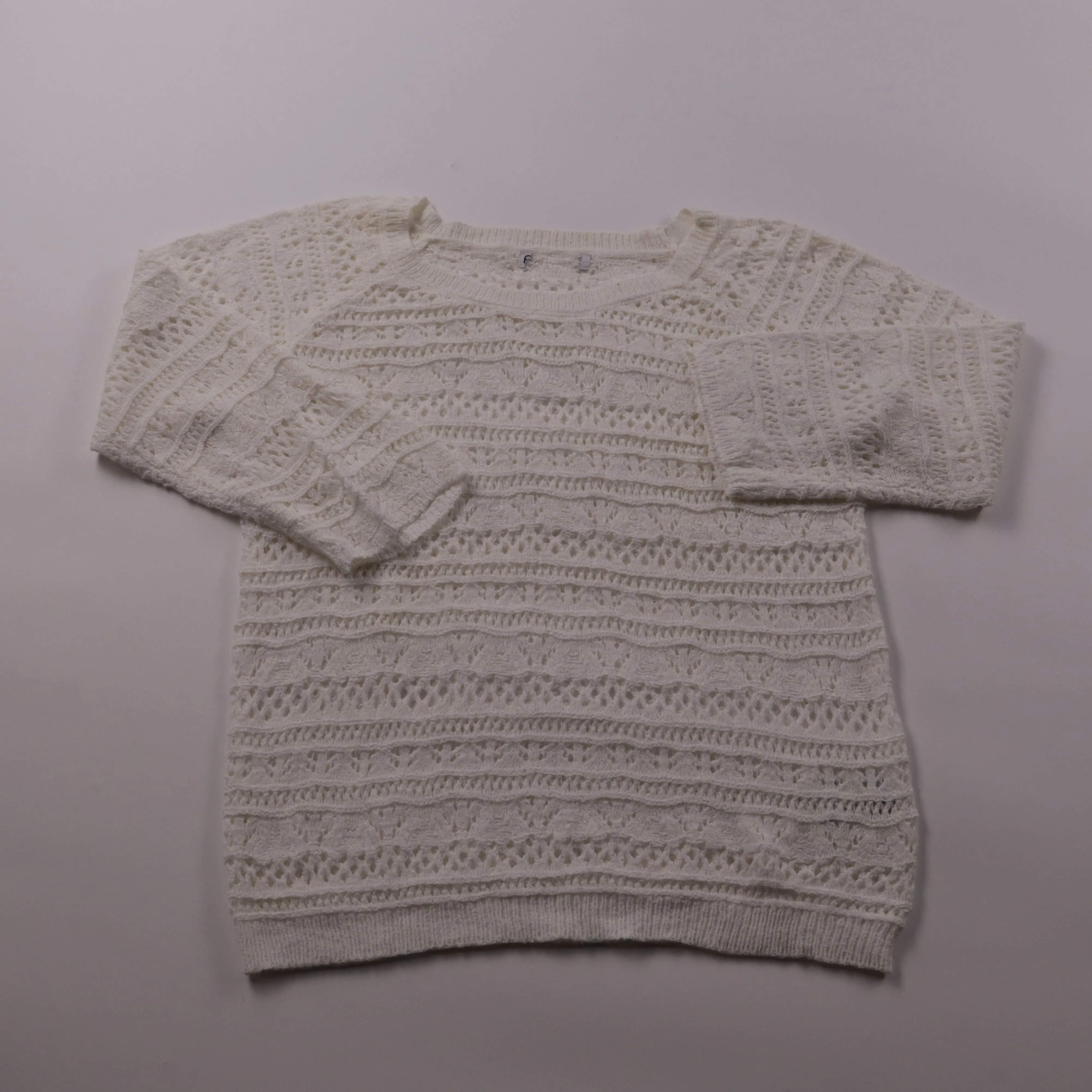Вязаный свитер без бренда, белого (молочного) цвета с ажурным узором и круглым вырезом. Подойдёт для прохладных летних вечеров и демисезона, хорошо смотрится в многослойных образах поверх топа. Лёгкая вязка даёт вентиляцию и комфорт при носке.
