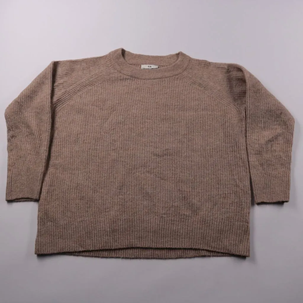Вязаный джемпер C&A бежево-коричневого меланжа с круглым вырезом и рукавом реглан. Подойдёт для повседневной носки и многослойных образов в прохладную погоду. Практичен тем, что нейтральный цвет легко сочетать с джинсами и базовыми брюками.