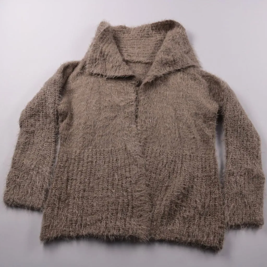Вязаный кардиган P.M. из мягкой пушистой пряжи с широким отложным воротником. Подойдёт для прохладной погоды и многослойных образов с джинсами или платьем. Практичное преимущество — тёплый материал и комфортная посадка без стеснения движений.