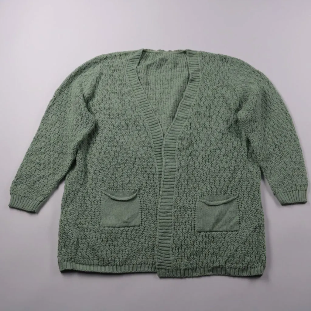 Вязаный кардиган без бренда в зелёном (оливковом) оттенке, с V-вырезом и накладными карманами. Подойдёт для повседневных образов в демисезон и прохладными летними вечерами, удобно носить поверх футболки или водолазки. Практичное преимущество — акрилова...