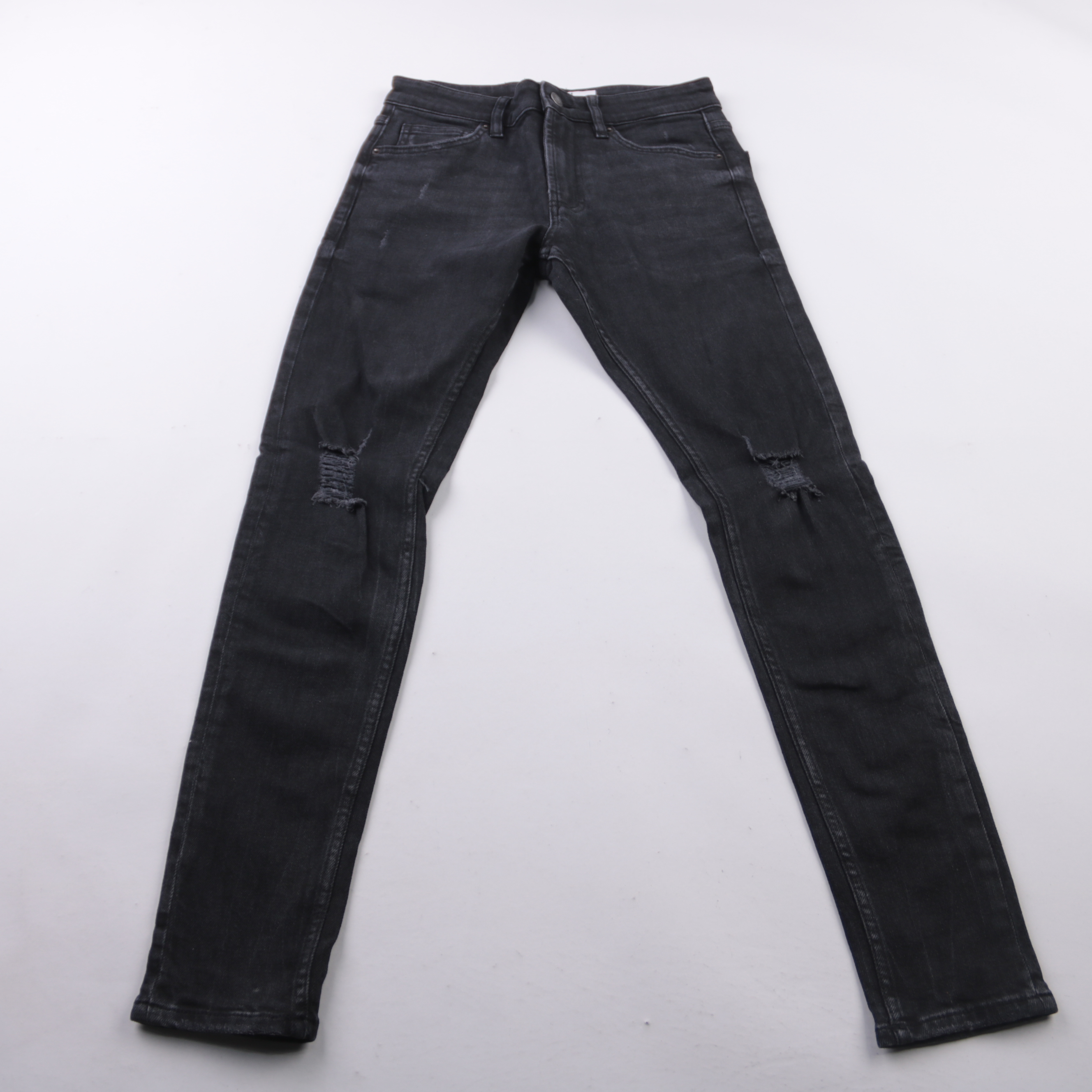 Чёрные джинсы Bershka из денима со слегка зауженными штанинами и декоративными потертостями на коленях. Подойдут для повседневных образов с кедами или ботинками в любой сезон. Плотная ткань хорошо держит форму и не требует сложного ухода.