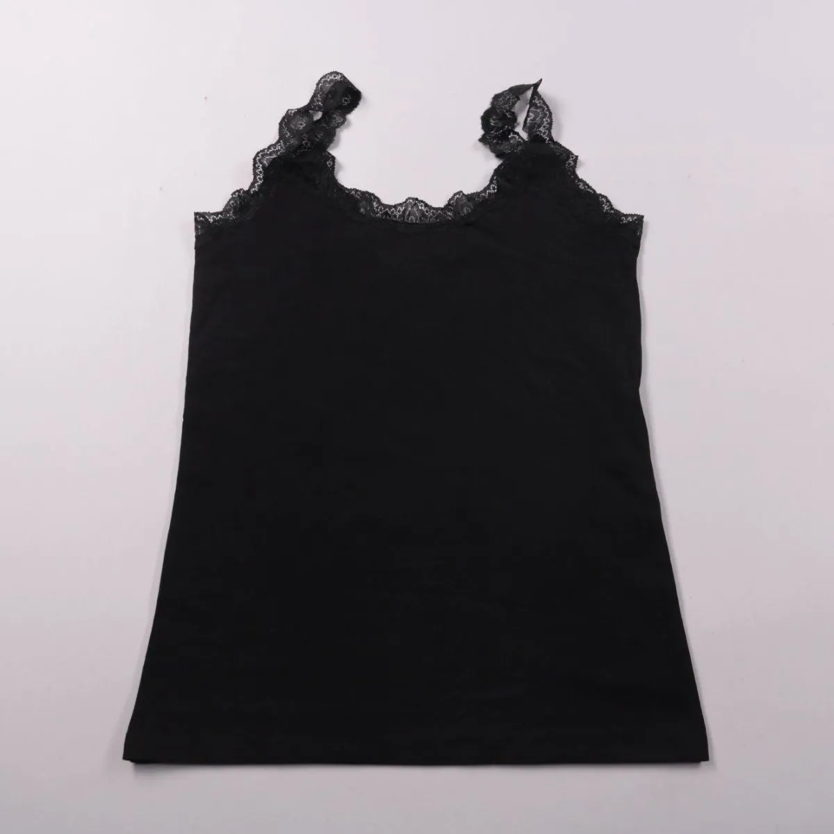 Женский топ George чёрного цвета на тонких бретелях с кружевной отделкой по верху. Подойдёт как нижний слой под рубашку, жакет или свитер, а также для дома. Хлопковая ткань с добавлением эластана хорошо тянется и комфортно сидит.