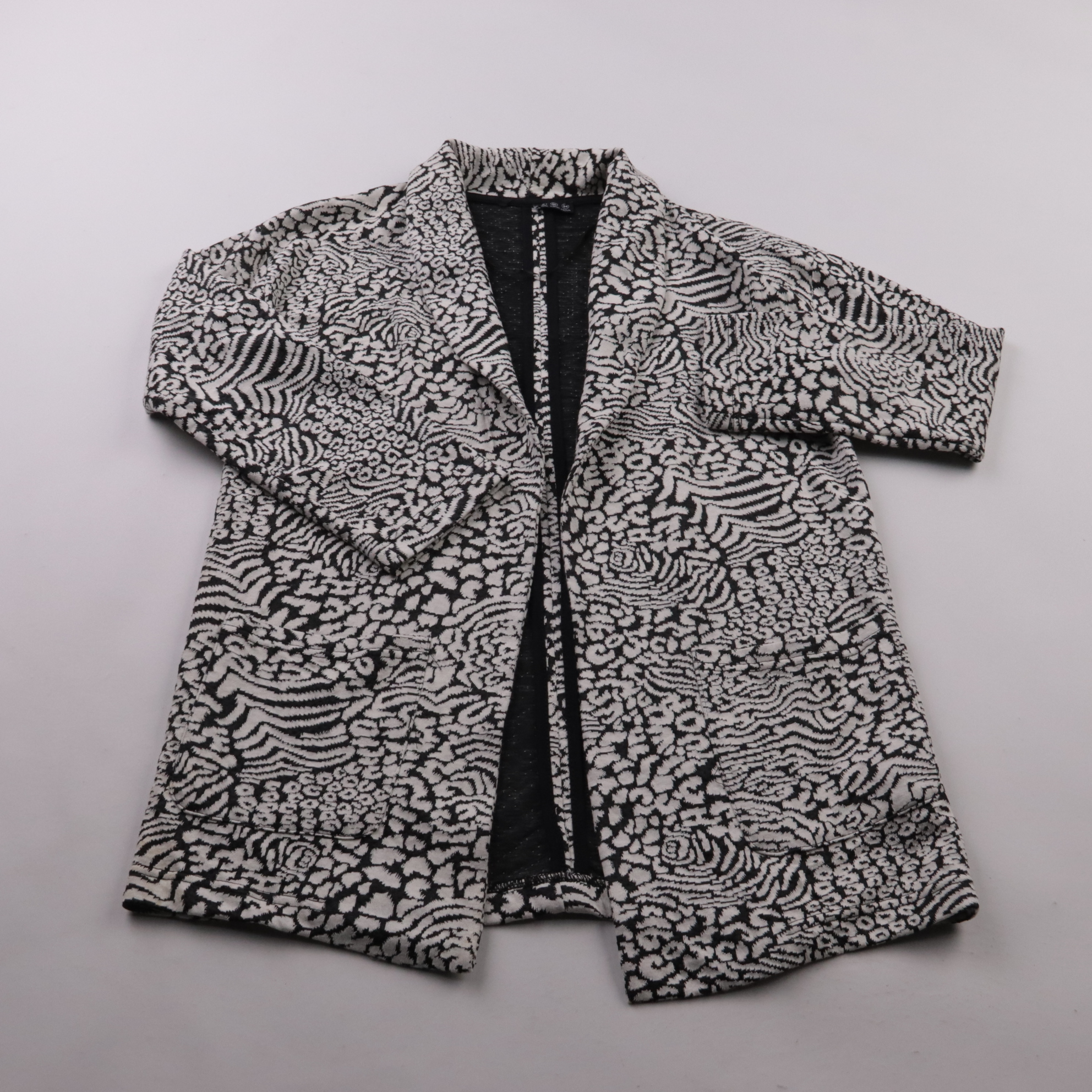 Женский пиджак Atmosphere в чёрно-белом принте, без застёжки. Подойдёт для офиса и повседневных образов с джинсами или однотонным платьем. Плотный трикотаж хорошо держит форму и не требует сложного ухода.