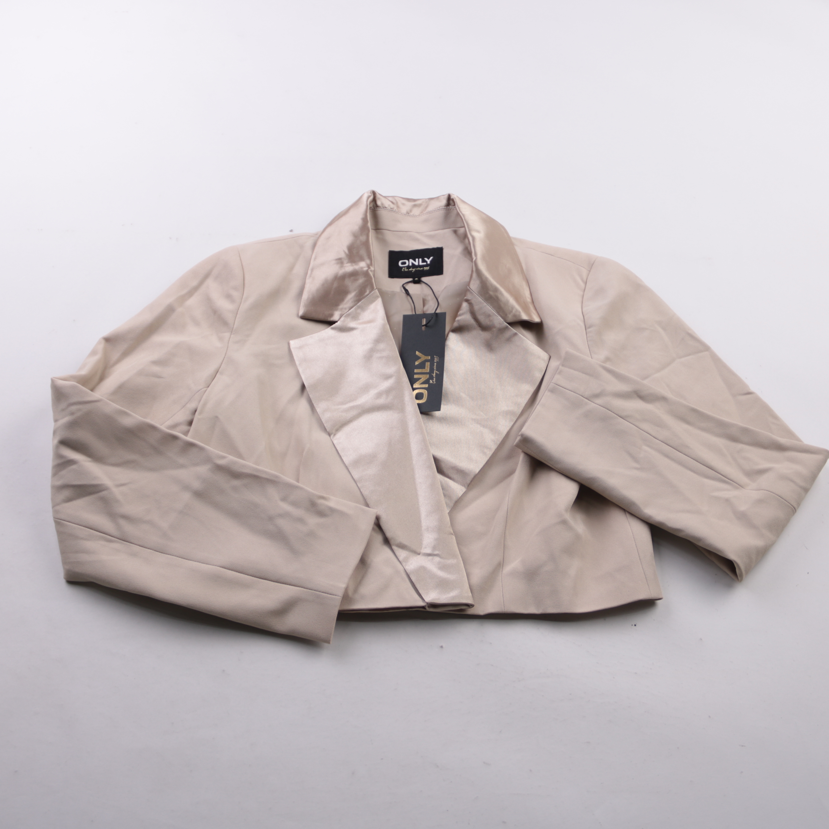 Укороченный пиджак Only в цвете Oxford Tan с контрастными атласными лацканами. Подойдёт для офиса, встреч и вечерних выходов, хорошо смотрится с брюками, юбкой или платьем. Ткань с эластаном немного тянется и комфортна в носке.