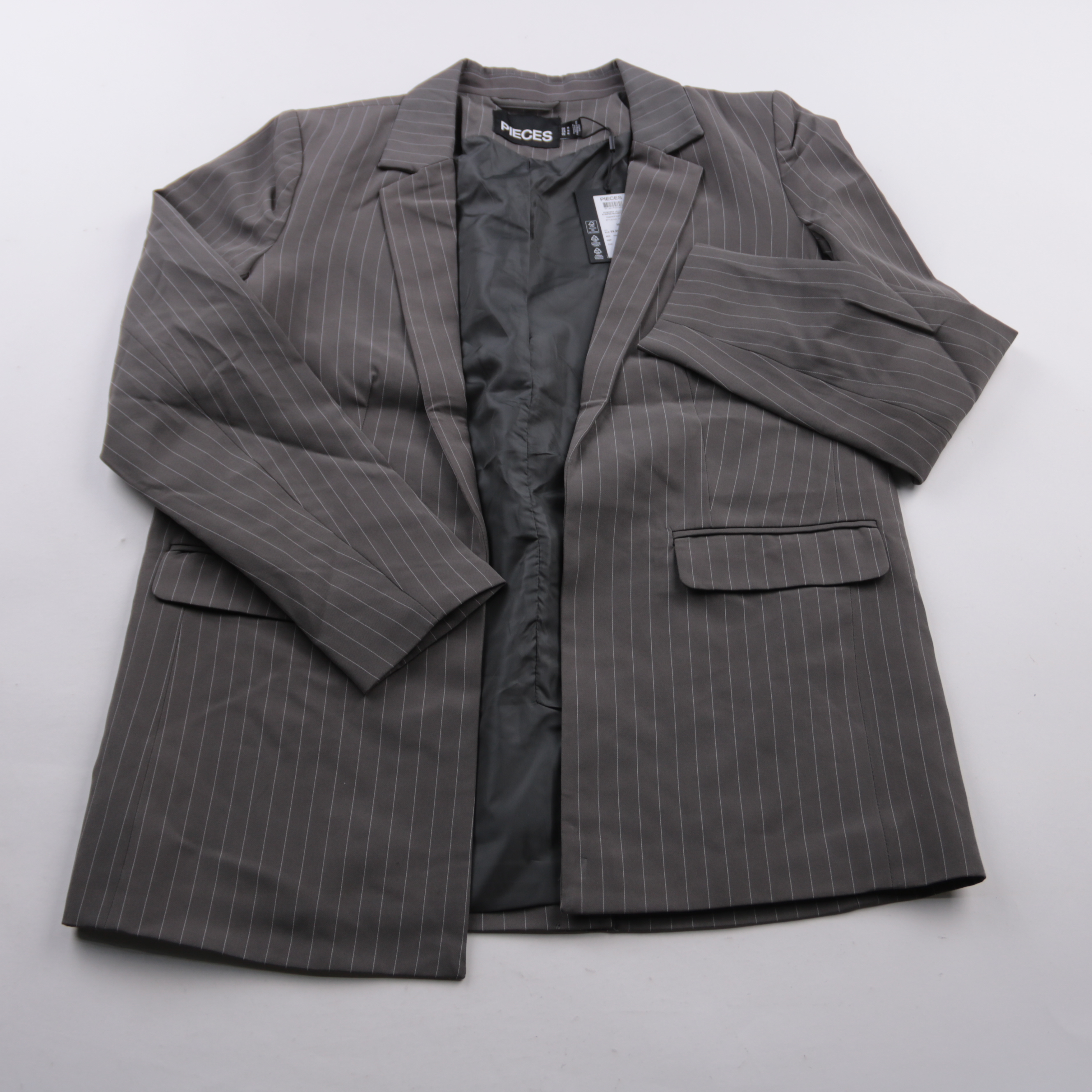 Женский пиджак Pieces серого цвета в тонкую полоску, с лацканами и накладными клапанами карманов. Подойдёт для офиса и повседневных образов с брюками или джинсами. Практичная подкладка помогает пиджаку держать форму и комфортно надеваться поверх топа и...
