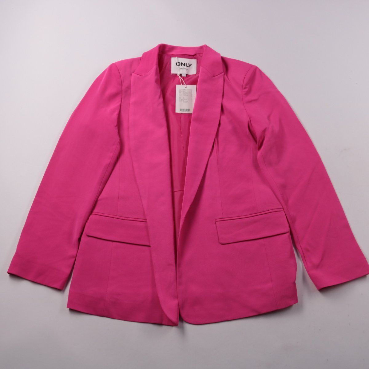 Женский пиджак ONLY tailoring яркого цвета фуксия с открытым передом и длинным рукавом. Подойдёт для летних образов в офис и на выход, хорошо сочетается с джинсами и брюками. Практичный плюс — ткань с эластаном слегка тянется и комфортно сидит.