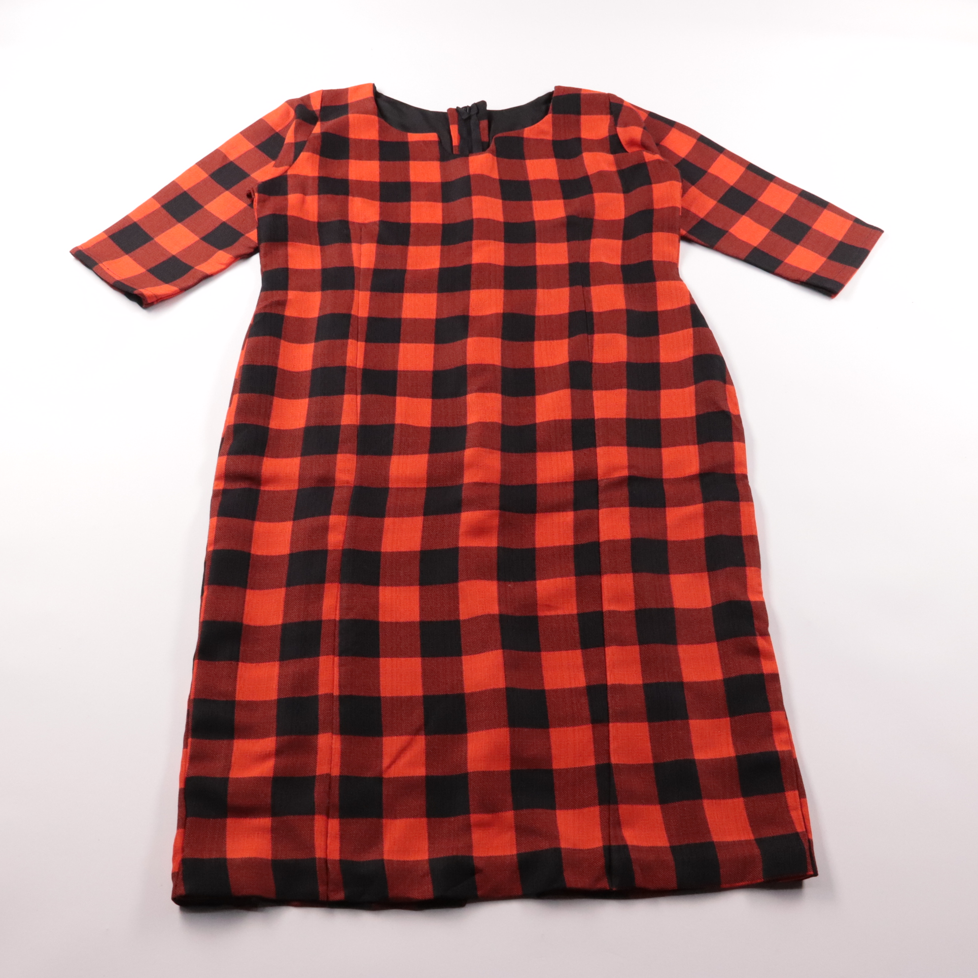 Платье прямого кроя в красно‑чёрную клетку, рукав 3/4, застёжка на молнию сзади. Подойдёт для повседневных образов и офиса, хорошо сочетается с ботильонами или кедами. Плотная ткань держит форму и не требует сложного ухода.