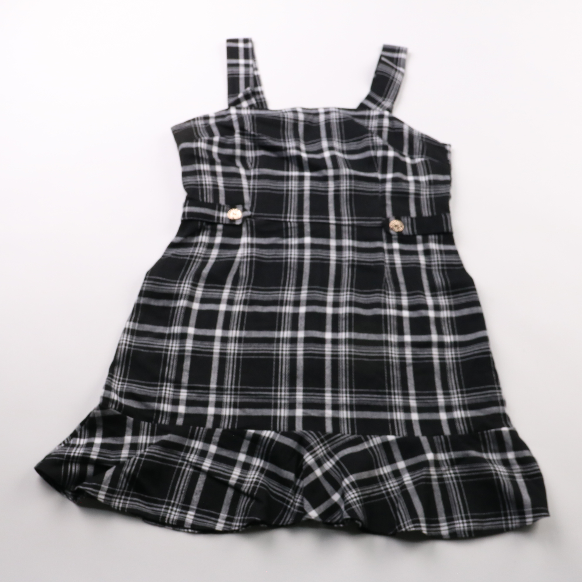 Платье Miss Selfridge в чёрно-белую клетку на широких бретелях, с декоративными пуговицами и оборкой по низу. Подойдёт для повседневных образов в городе, можно носить с водолазкой или футболкой. Плотная ткань держит форму и практически не мнётся.