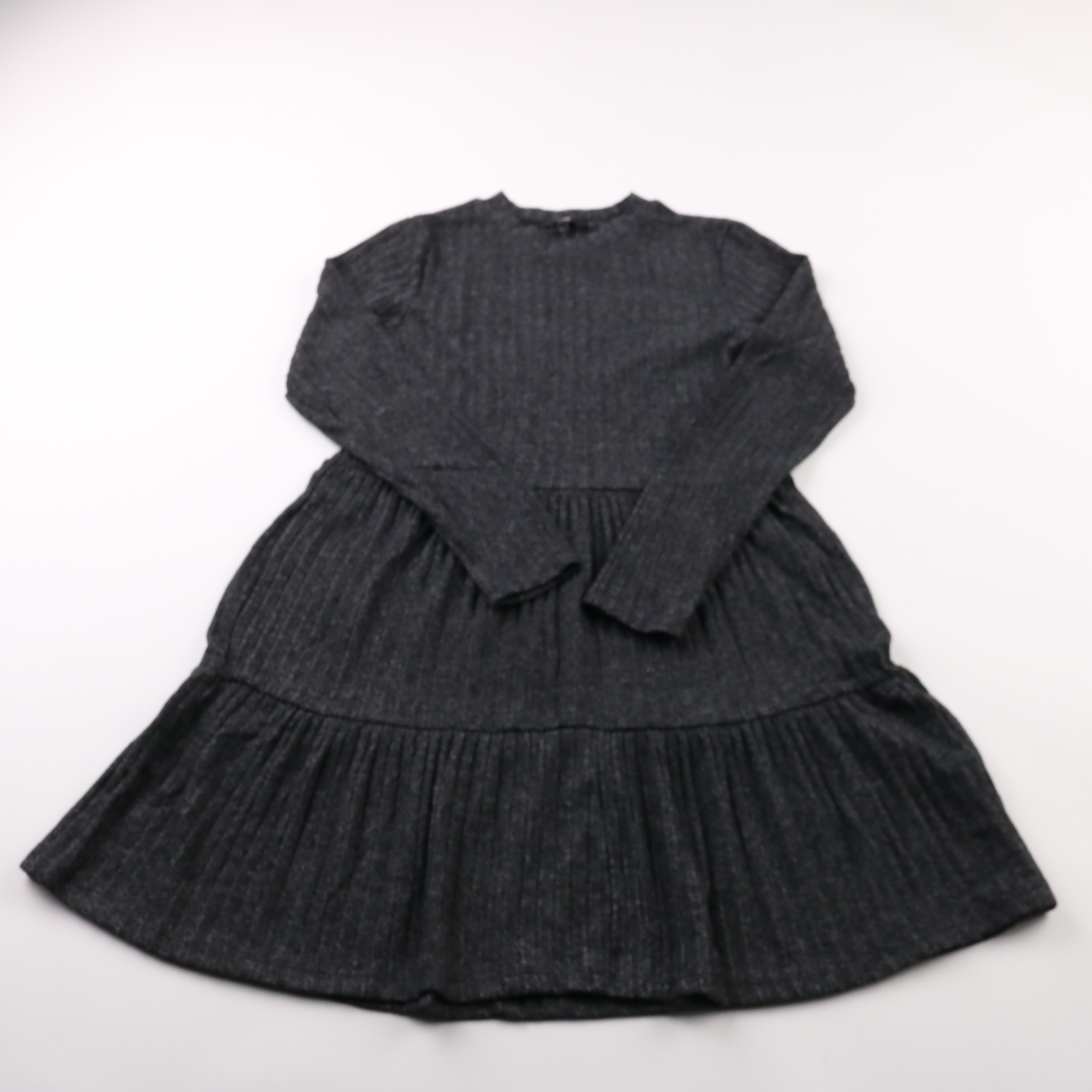 Трикотажное платье C&A тёмно-серого цвета в рубчик, с длинным рукавом и ярусной юбкой. Подойдёт для повседневных образов в прохладную погоду — с ботинками или кедами. Мягкий материал тянется и не сковывает движения.