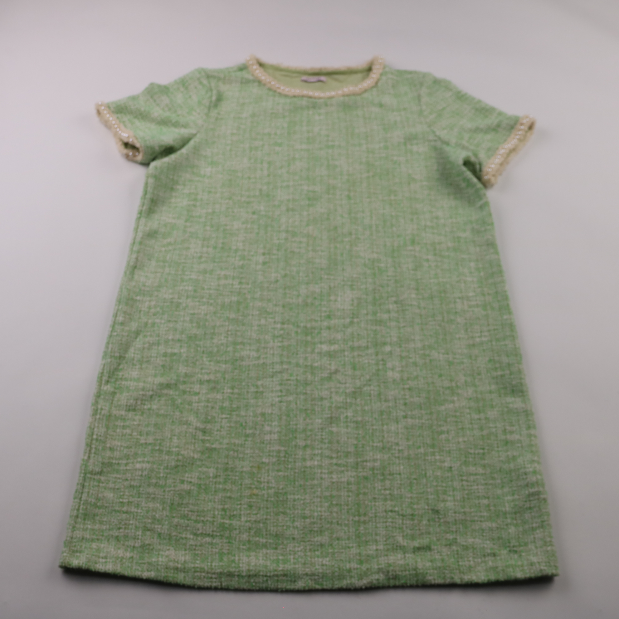 Зелёное твидовое платье Orsay прямого кроя с коротким рукавом и отделкой жемчужными бусинами по горловине и рукавам. Подойдёт для офиса и повседневных выходов, хорошо сочетается с жакетом и лодочками. Плотная фактурная ткань держит форму и выглядит акк...