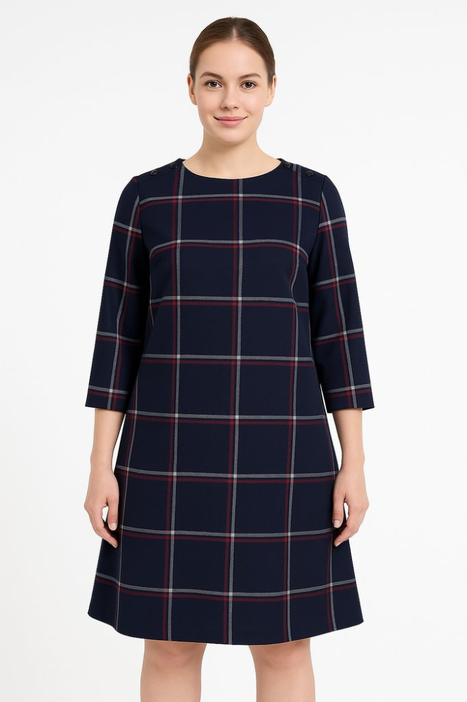Повседневное платье Phase Eight прямого кроя в тёмно-синюю клетку с рукавом 3/4. Подойдёт для офиса и на каждый день, легко сочетается с жакетом или кардиганом. Практичный немнущийся материал удобен в уходе и хорошо держит форму.