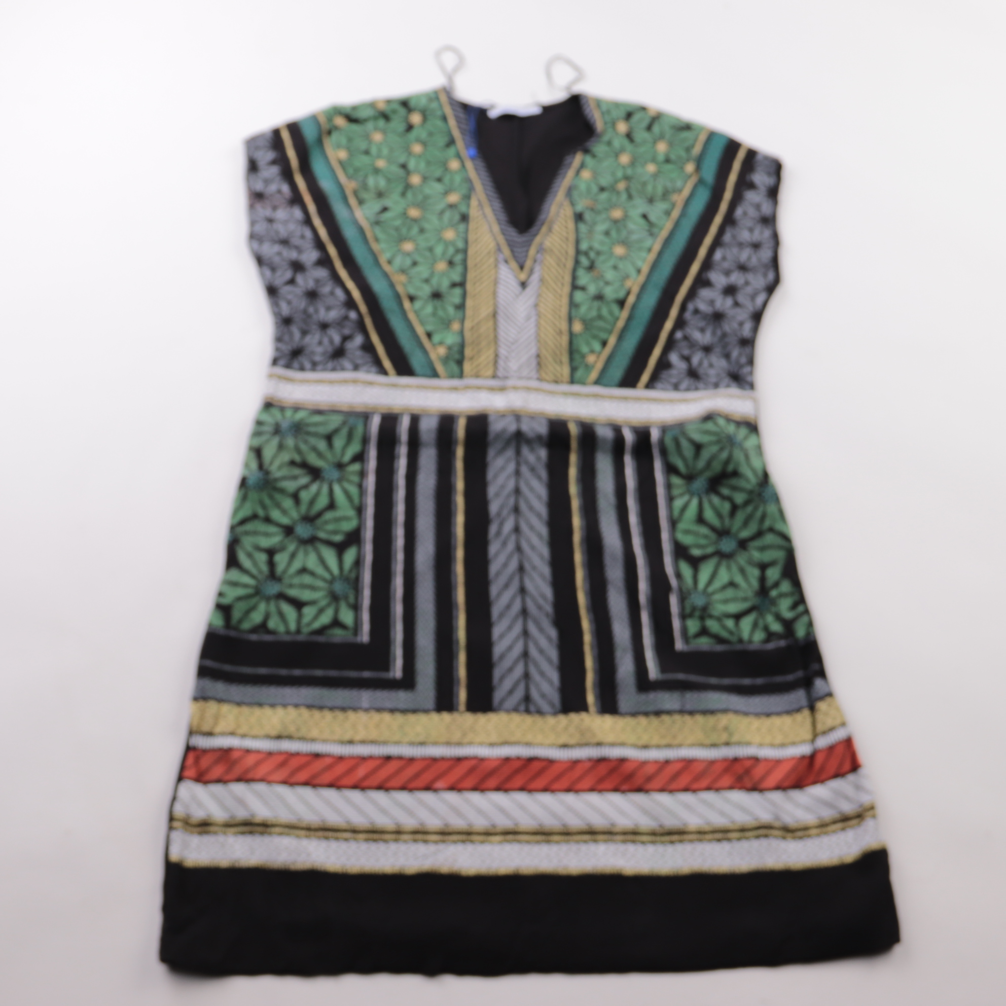 Повседневное платье Zara Basic без рукавов с V-образным вырезом и ярким геометрическим принтом. Подойдёт для лета и отдыха, легко сочетается с сандалиями или кедами. Лёгкая ткань комфортна в жару и быстро сохнет после стирки.