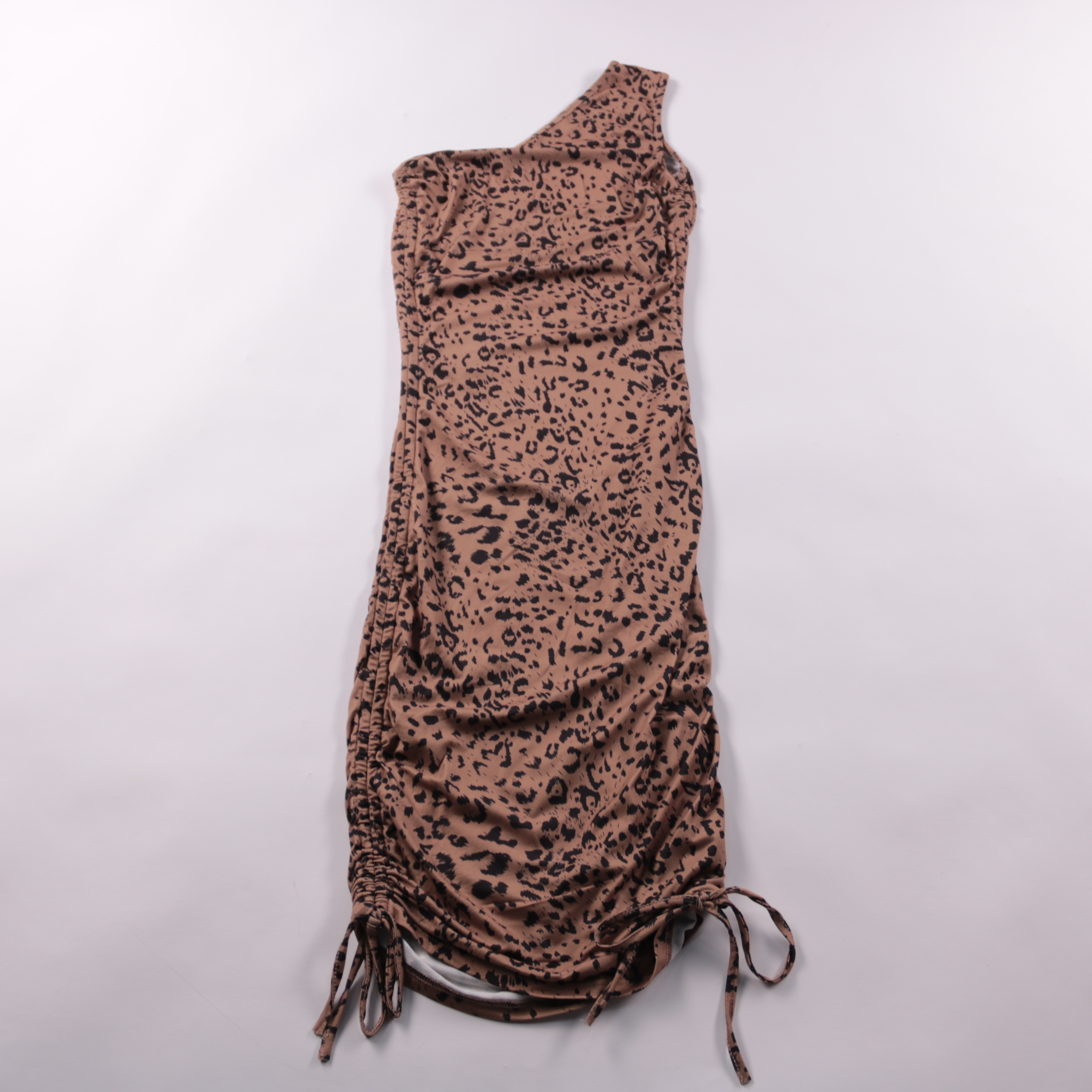 Повседневное платье Shein в леопардовый принт, асимметричное на одно плечо, с кулисками по бокам. Подойдёт для вечерних выходов и летних прогулок, можно регулировать длину и посадку за счёт завязок. Ткань эластичная, комфортно сидит по фигуре и не сков...