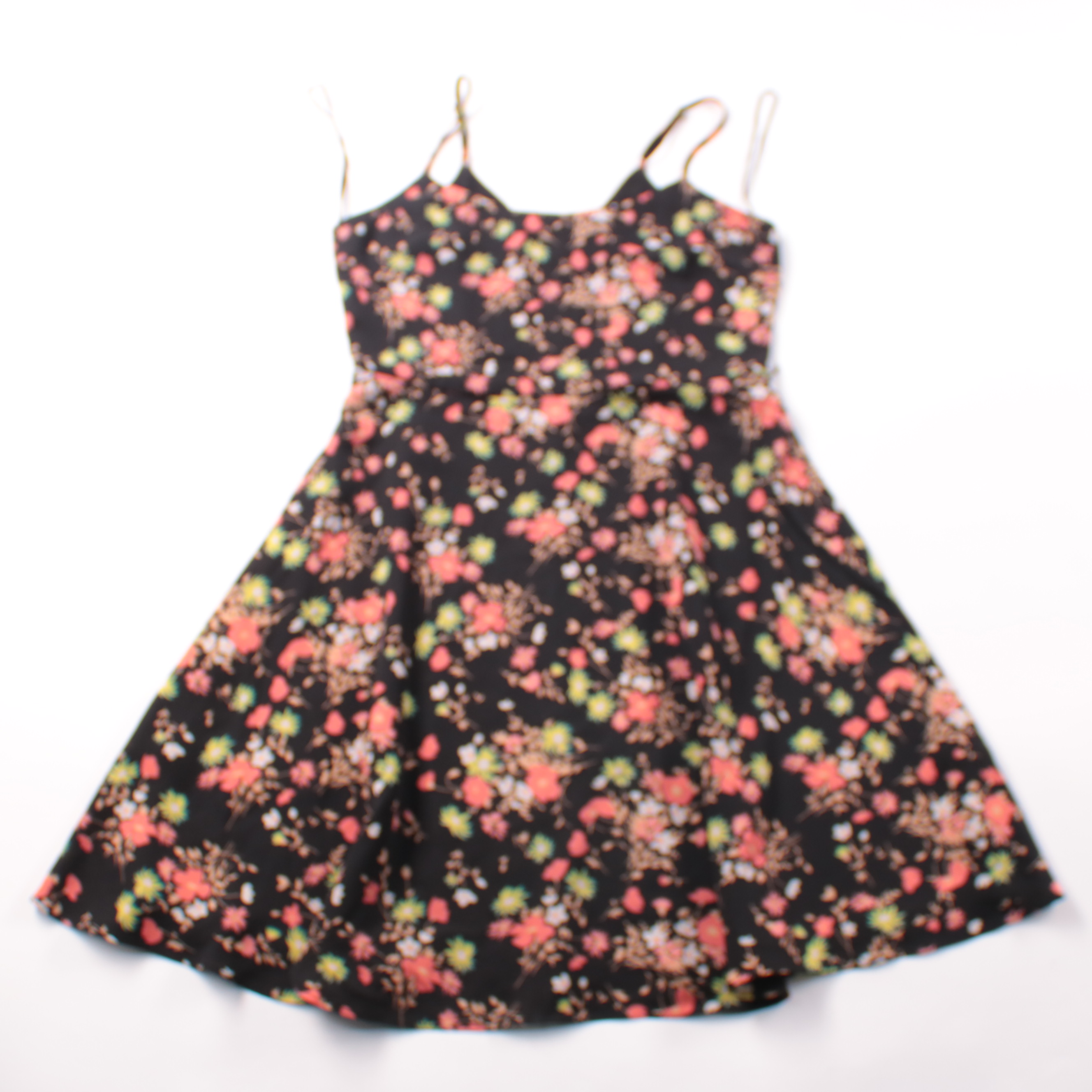 Повседневное платье Oasis на тонких бретелях, чёрное с цветочным принтом и расклешённой юбкой. Подойдёт для лета, прогулок и отпуска, легко сочетается с кедами или босоножками. Ткань из полиэстера почти не мнётся и быстро сохнет.