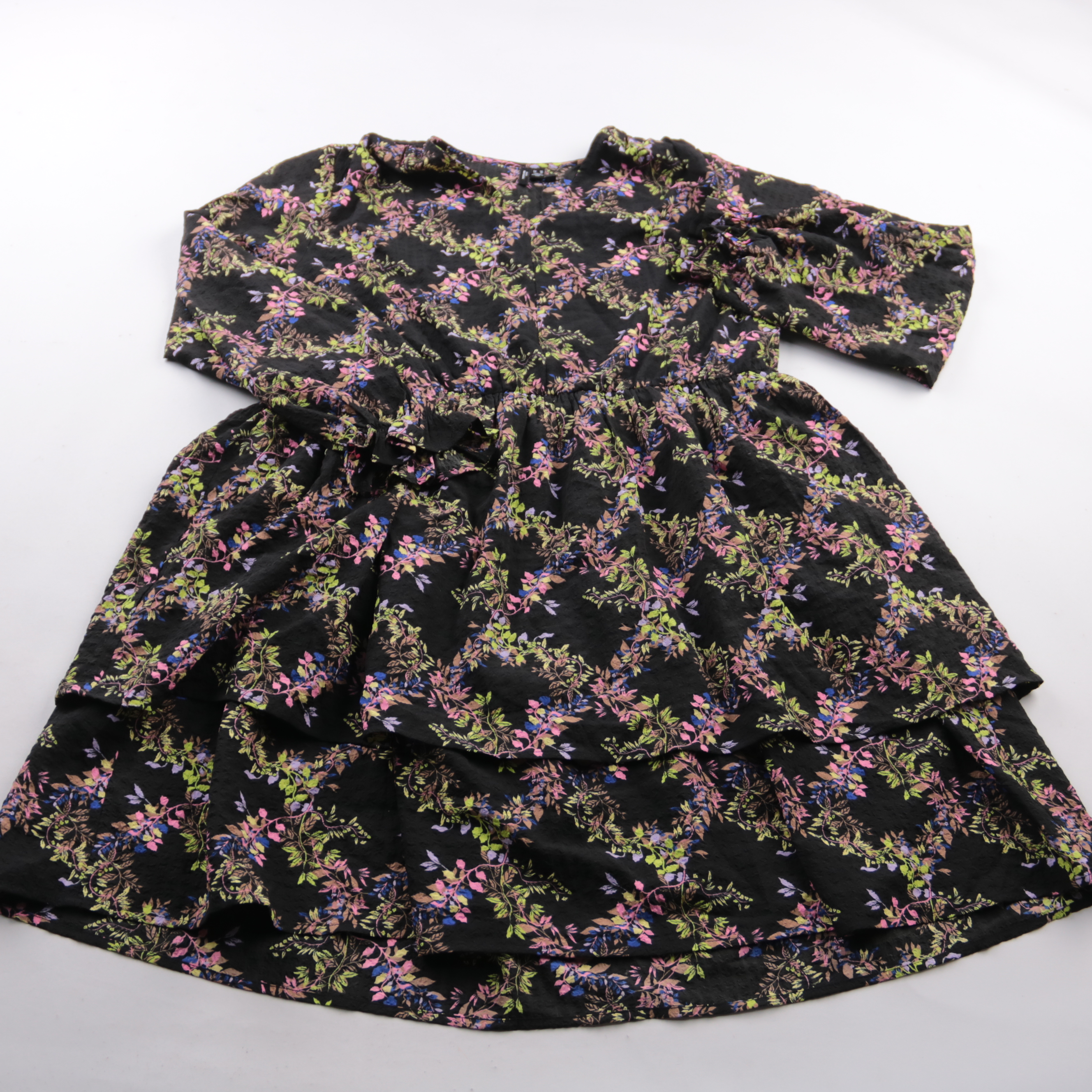 Повседневное платье Vero Moda Curve на чёрной основе с цветочным принтом, рукавами 3/4 и ярусной юбкой. Подойдёт для города и офиса в стиле casual, хорошо смотрится с ботильонами или кедами. Ткань с эластаном слегка тянется и комфортна в носке.