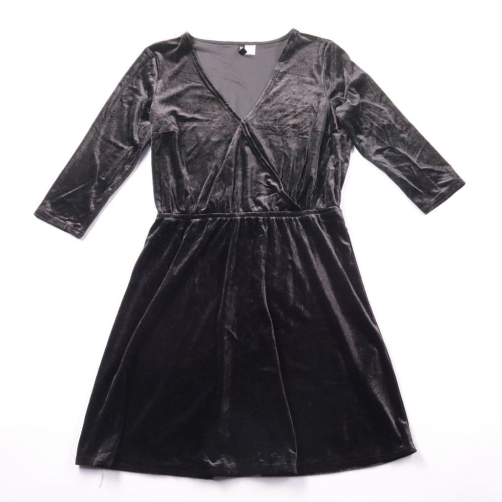 Бархатное платье H&M чёрного цвета с запахом и V-образным вырезом, рукава 3/4. Подойдёт для повседневных образов и выходов в прохладную погоду, красиво подчёркивает талию. Практично тем, что эластичная ткань комфортно садится по фигуре и не сковывает д...