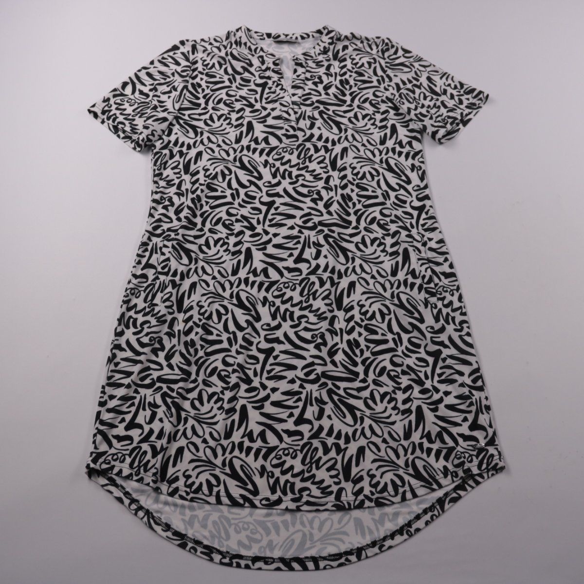 Повседневное платье Angelie Milan в черно-белом принте с коротким рукавом и V-образным вырезом. Подойдёт для прогулок и повседневных дел в тёплую погоду, легко сочетается с кедами или сандалиями. Тянущийся материал хорошо садится по фигуре и не сковывает движения.