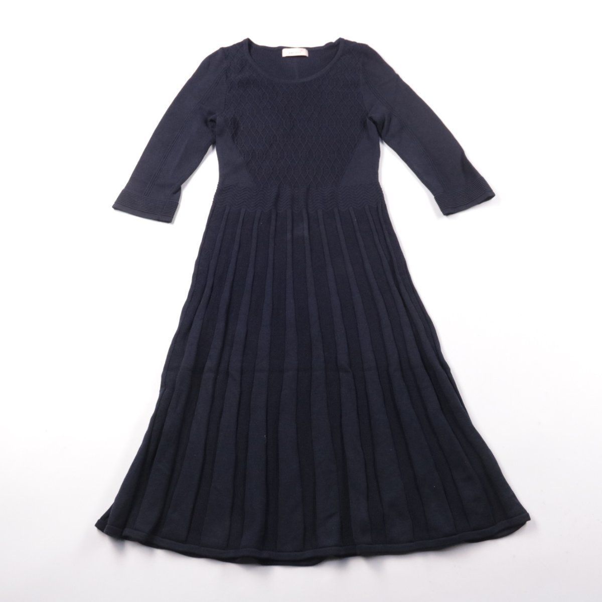 Трикотажное платье M&S тёмно-синего (navy) цвета с рукавом 3/4 и плиссированной юбкой. Подойдёт для офиса и повседневных выходов в прохладную погоду, хорошо смотрится с ботинками или туфлями. Практичный плюс — немнущийся фактурный трикотаж и удобная посадка.