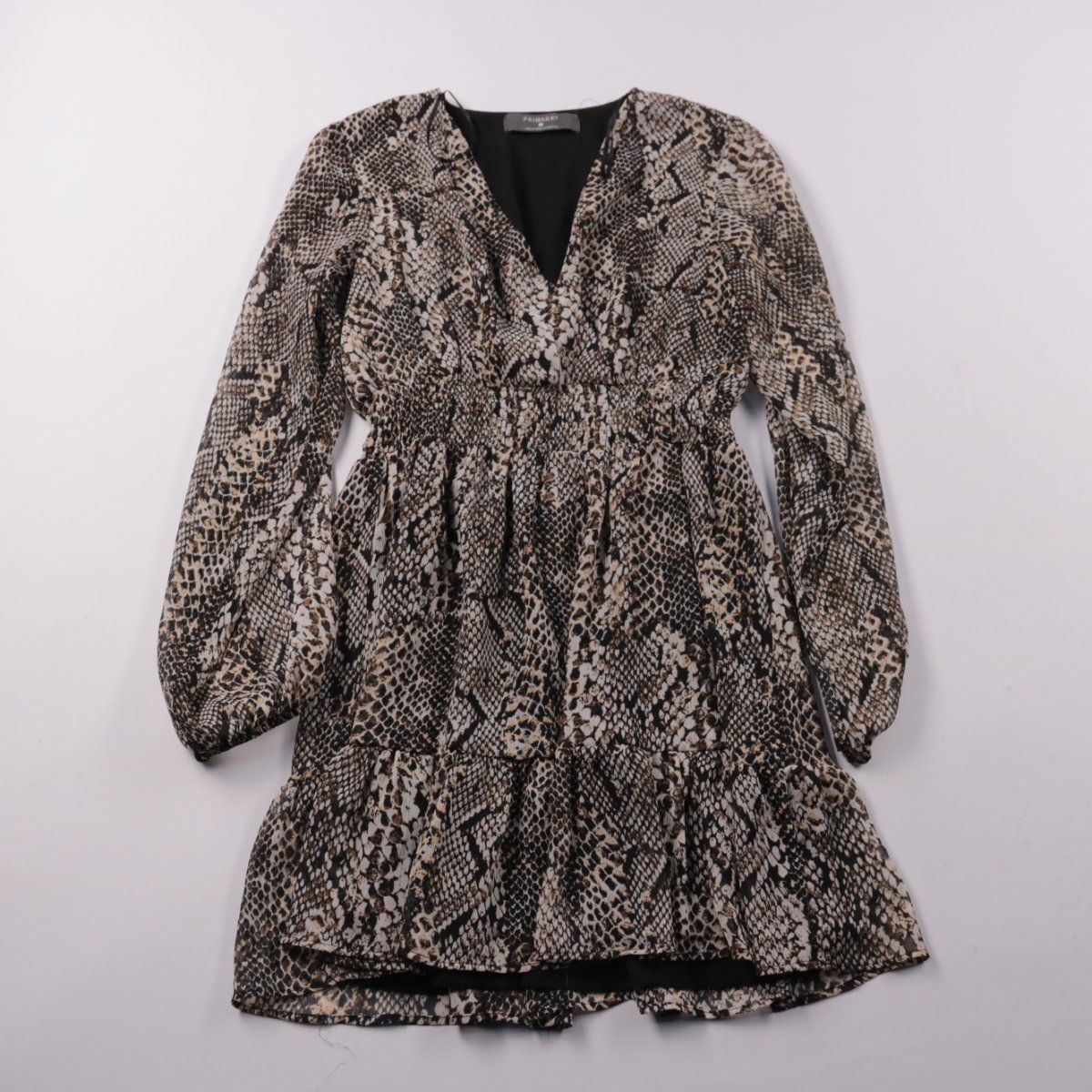 Платье Primark с V-образным вырезом и пышными рукавами, выполнено в принте под змеиную кожу. Подойдёт для повседневных образов и выходов, легко сочетается с ботинками или туфлями. Полиэстеровый материал практичен в уходе и почти не мнётся.