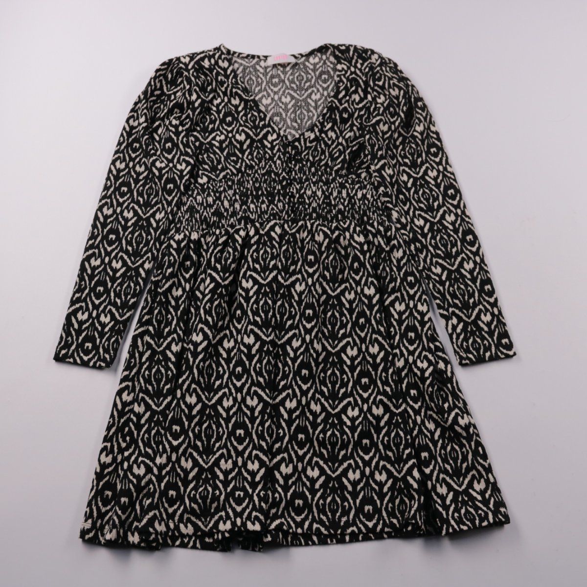 Повседневное платье Savida с длинным рукавом и V-образным вырезом, выполнено в чёрно-белом графичном принте. Эластичная сборка на талии делает посадку комфортной и подчёркивает силуэт, подойдёт для города и офиса. Материал почти не мнётся и быстро сохнет, удобно в уходе.
