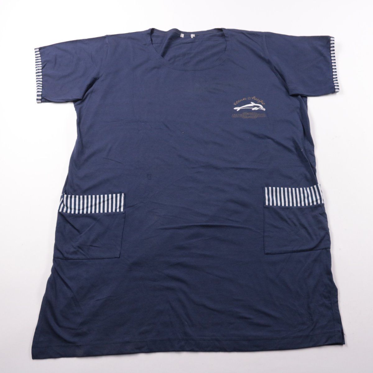 Повседневное платье-туника тёмно-синего цвета с коротким рукавом и накладными карманами с полосатыми вставками. Подойдёт для дома и отдыха в тёплую погоду, легко сочетать с кедами или сандалиями. Смесовый состав (хлопок/полиэстер) практичен в носке и проще в уходе.
