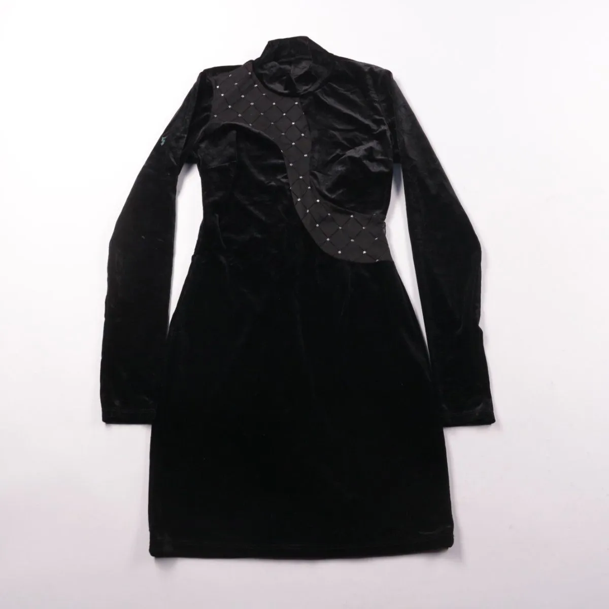 Чёрное облегающее платье с длинным рукавом и акцентной вставкой из сетки со стразами на груди. Подойдёт для вечерних выходов и мероприятий, хорошо смотрится с каблуками и минималистичными аксессуарами. Эластичный материал тянется и комфортно садится по фигуре.