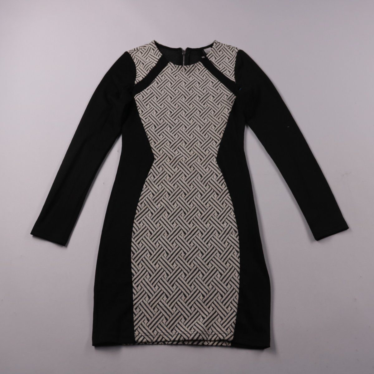 Женское повседневное платье-футляр с длинным рукавом: чёрные боковые вставки и центральная панель с геометрическим чёрно-белым узором. Подойдёт для офиса и на каждый день, хорошо смотрится с туфлями или ботильонами. Эластичная ткань комфортно садится по фигуре.