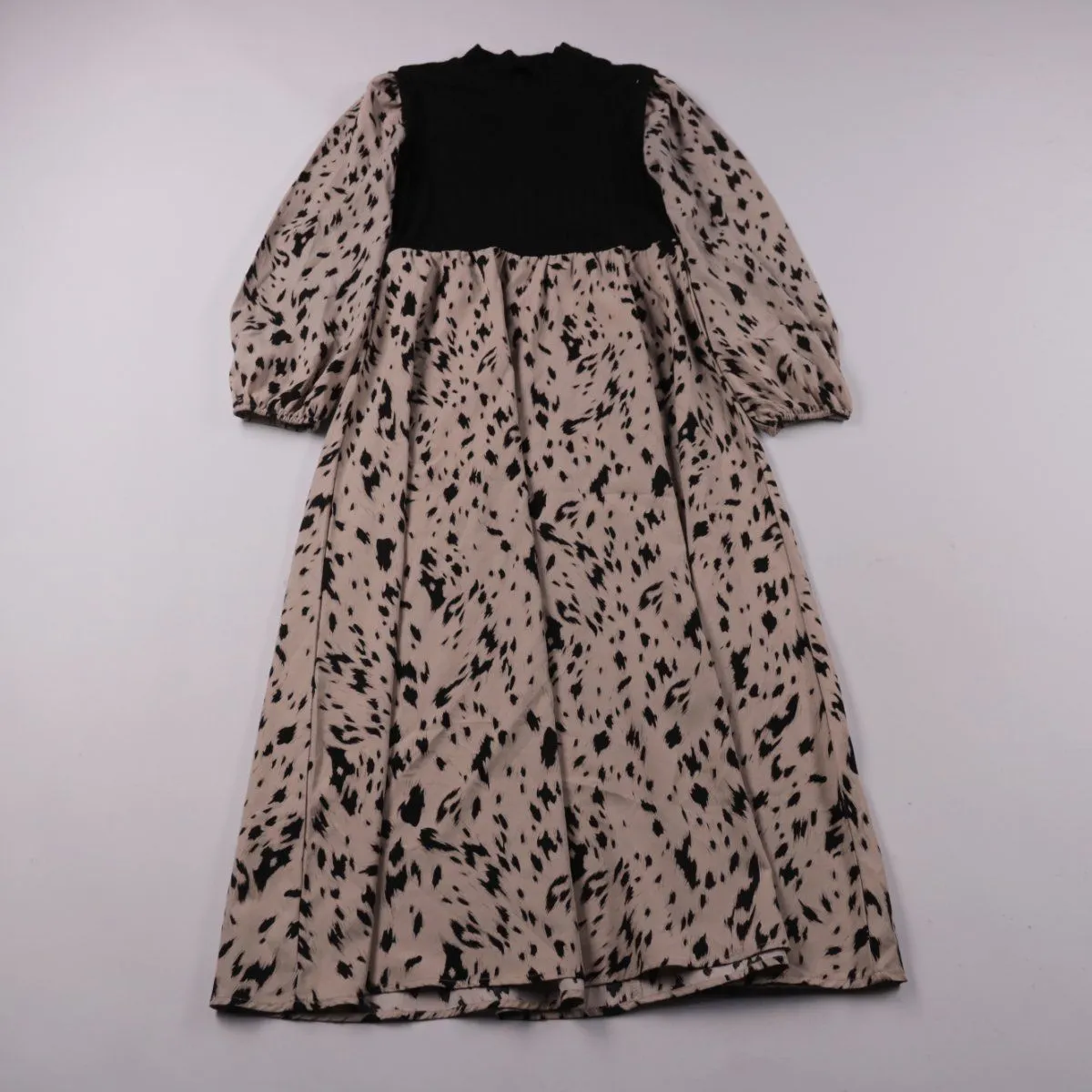 Повседневное платье SHEIN с контрастным чёрным верхом и бежевой юбкой с анималистичным принтом, рукава объёмные. Подойдёт для прогулок и повседневных выходов в тёплую погоду. Практичный плюс — лёгкая ткань и свободный крой, не сковывает движения.