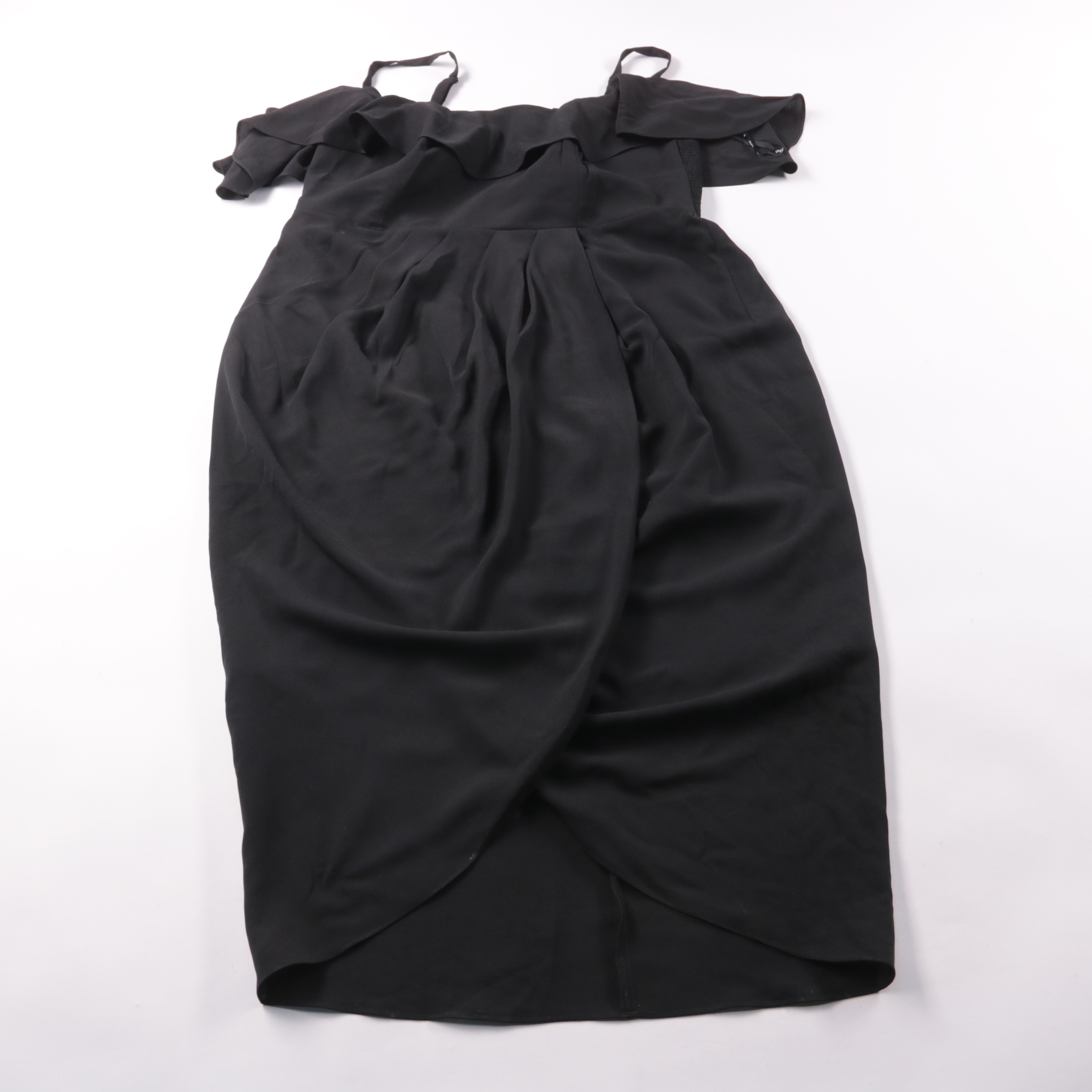Черное платье City Chic с открытыми плечами и тонкими бретелями, с мягкой драпировкой и запахом по юбке. Подойдет для вечера, мероприятия или ужина, легко сочетается с каблуками и клатчем. Плотная подкладка слегка тянется и комфортно сидит по фигуре.