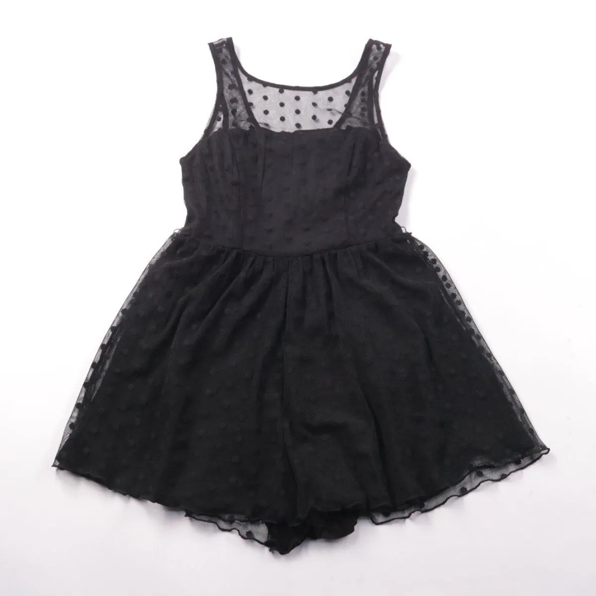 Черное платье Bershka с пышной юбкой и вставками из сетки в горошек на лифе. Подойдёт для вечерних выходов и мероприятий, хорошо смотрится с туфлями или босоножками. Практичное преимущество — лёгкая ткань и подкладка делают посадку аккуратной и комфортной.