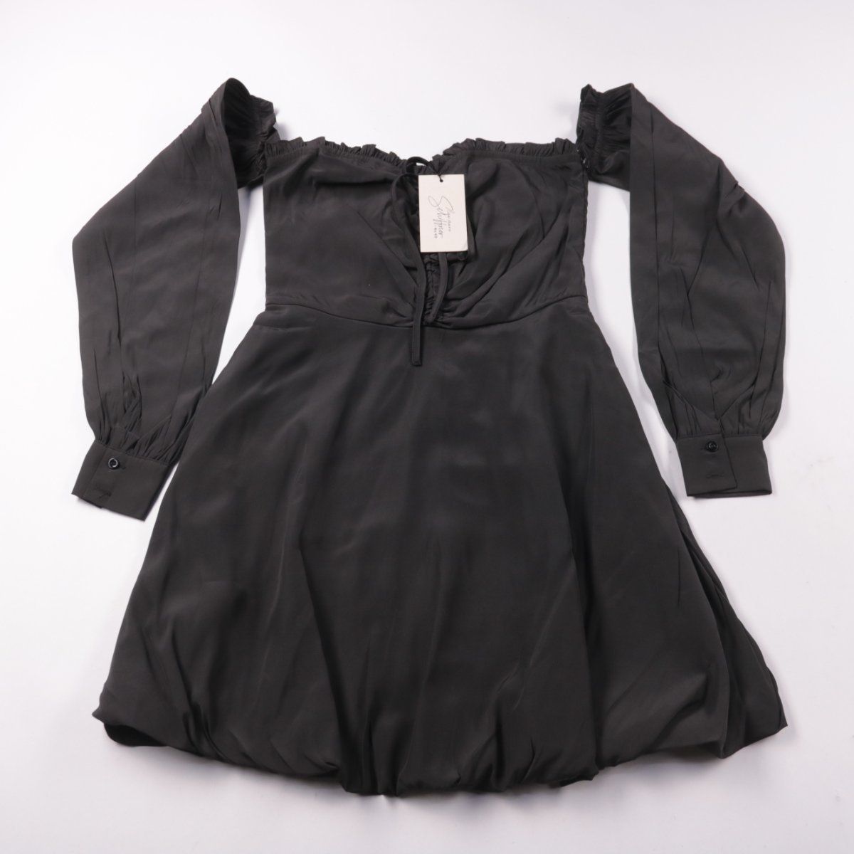 Вечернее платье NA-KD чёрного цвета, с открытой линией плеч и объёмными длинными рукавами на манжетах. Подойдёт для вечерних выходов и мероприятий, хорошо смотрится с туфлями и клатчем. Практичный плюс — лёгкая ткань на основе полиэстера проста в уходе.