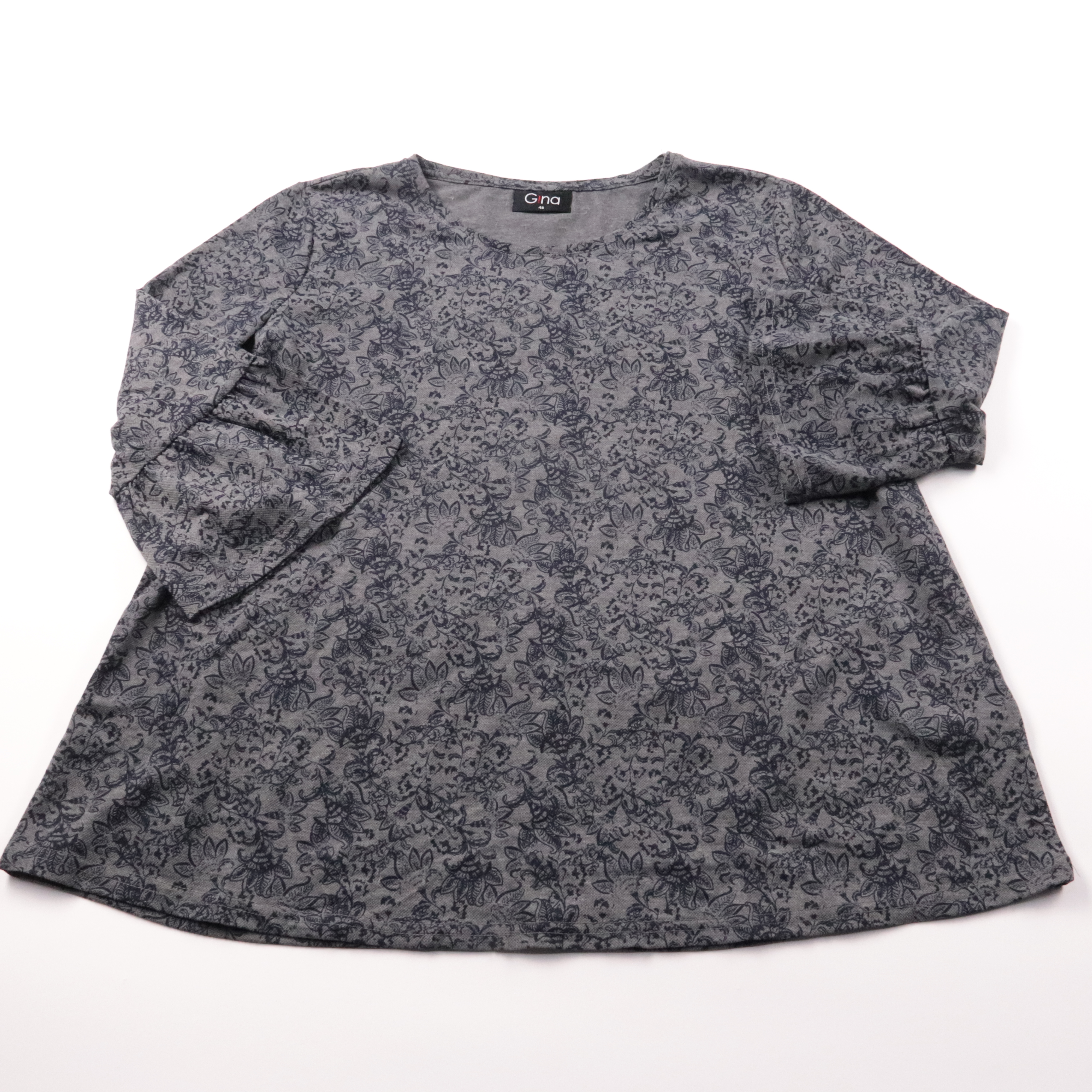 Блузка Gina серого цвета с тёмным цветочным принтом и круглым вырезом. Подойдёт для повседневных образов и офиса, хорошо сочетается с джинсами или классическими брюками. Ткань эластичная, поэтому вещь комфортно садится по фигуре и не сковывает движения.