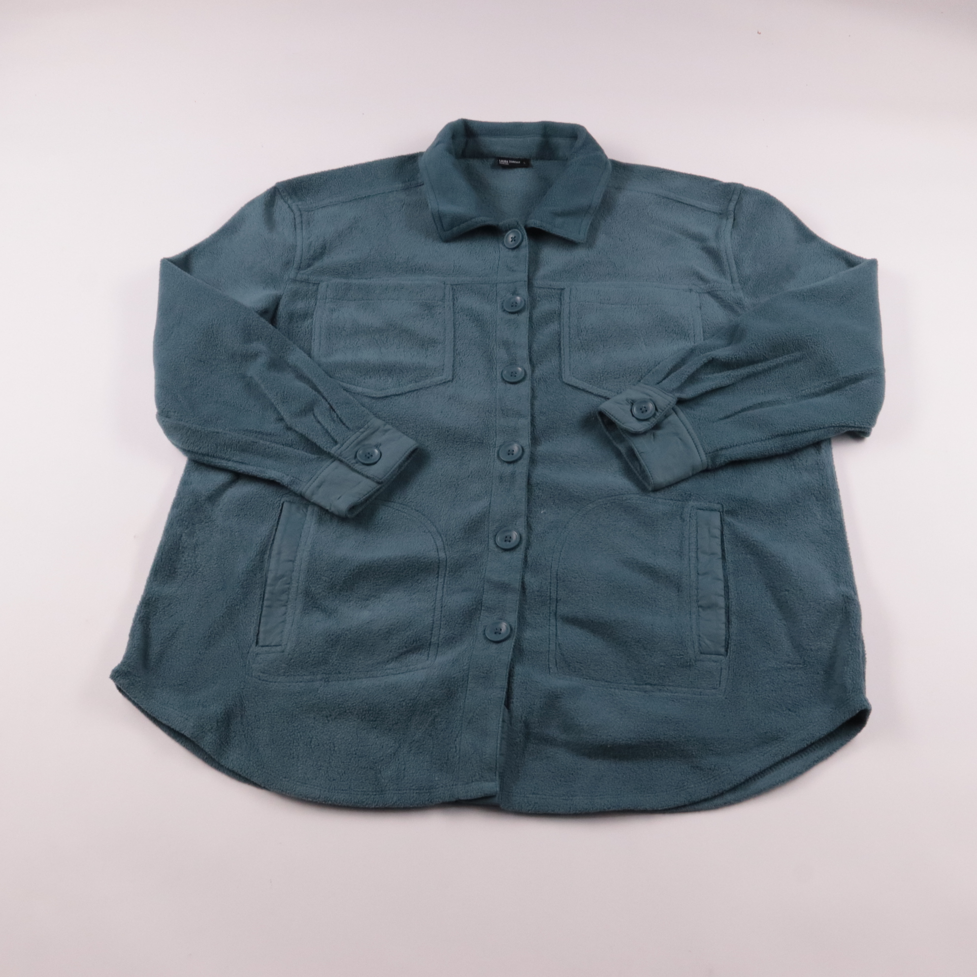 Флисовая рубашка Laura Torelli в спокойном сине-зелёном оттенке, на пуговицах и с накладными карманами. Подойдёт для прогулок и поездок в прохладную погоду, хорошо смотрится как верхний слой поверх футболки. Мягкий флис быстро сохнет и прост в уходе.