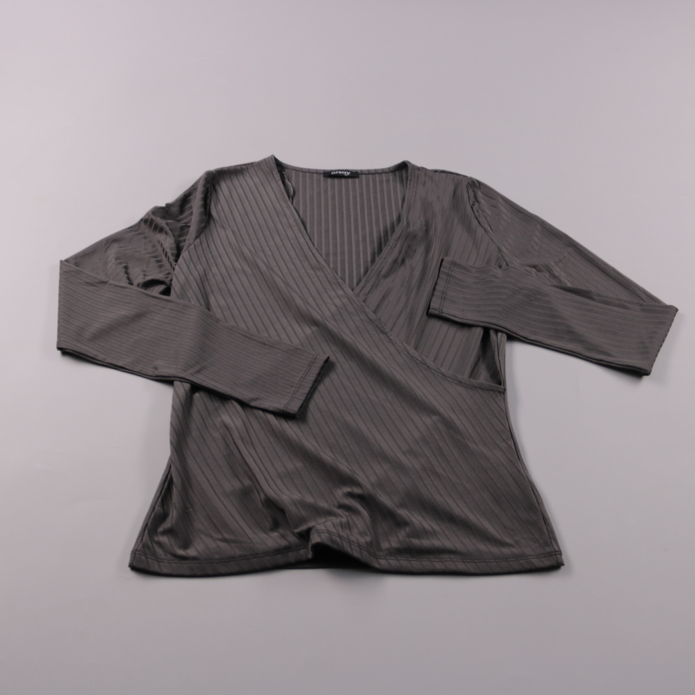 Женская блузка Orsay серого цвета в тонкую полоску, с запахом и V-образным вырезом. Подойдёт для офиса и повседневных образов, хорошо сочетается с брюками и юбками. Практичный плюс — лёгкая синтетическая ткань почти не мнётся и проста в уходе.