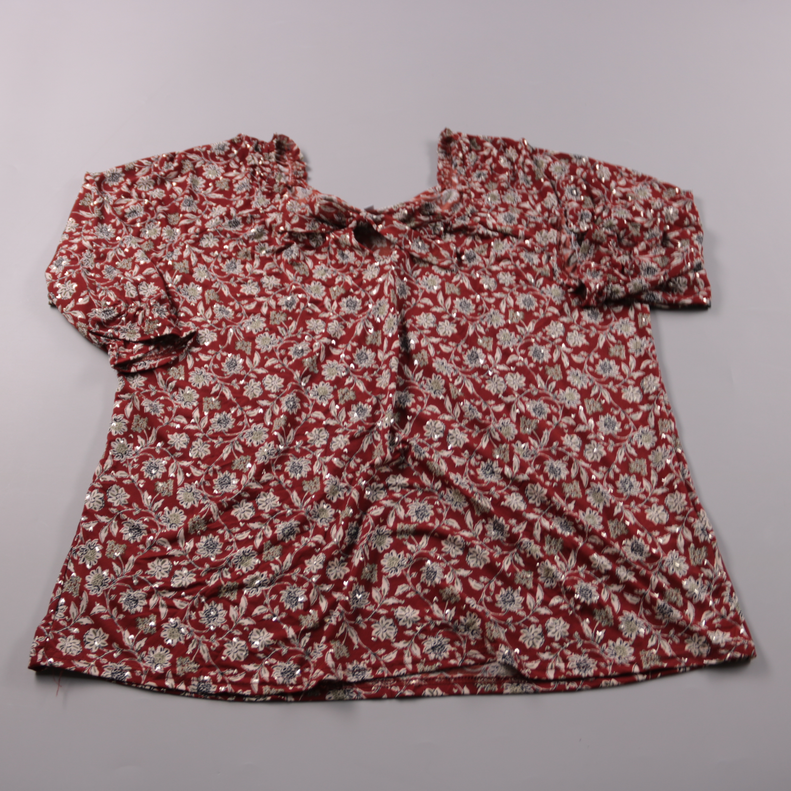Женская блузка с цветочным принтом на красном фоне и легким блеском, с коротким рукавом. Подойдет для летних прогулок и повседневных образов с джинсами или юбкой. Ткань тонкая и почти не мнется, удобно брать в поездки.