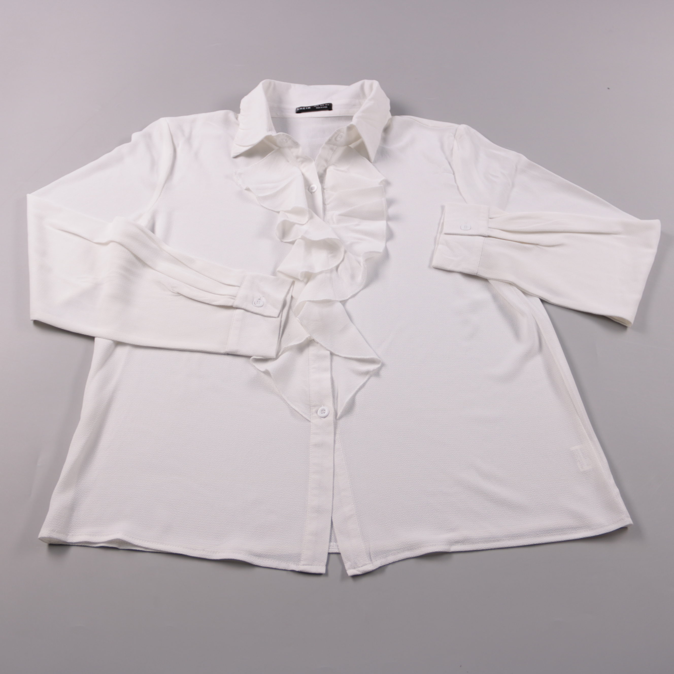Белая блузка Shein с длинным рукавом и воланами по планке застёжки. Подойдёт для офиса, учёбы и более нарядных образов с юбкой или брюками. Материал из 100% полиэстера почти не мнётся и быстро сохнет.