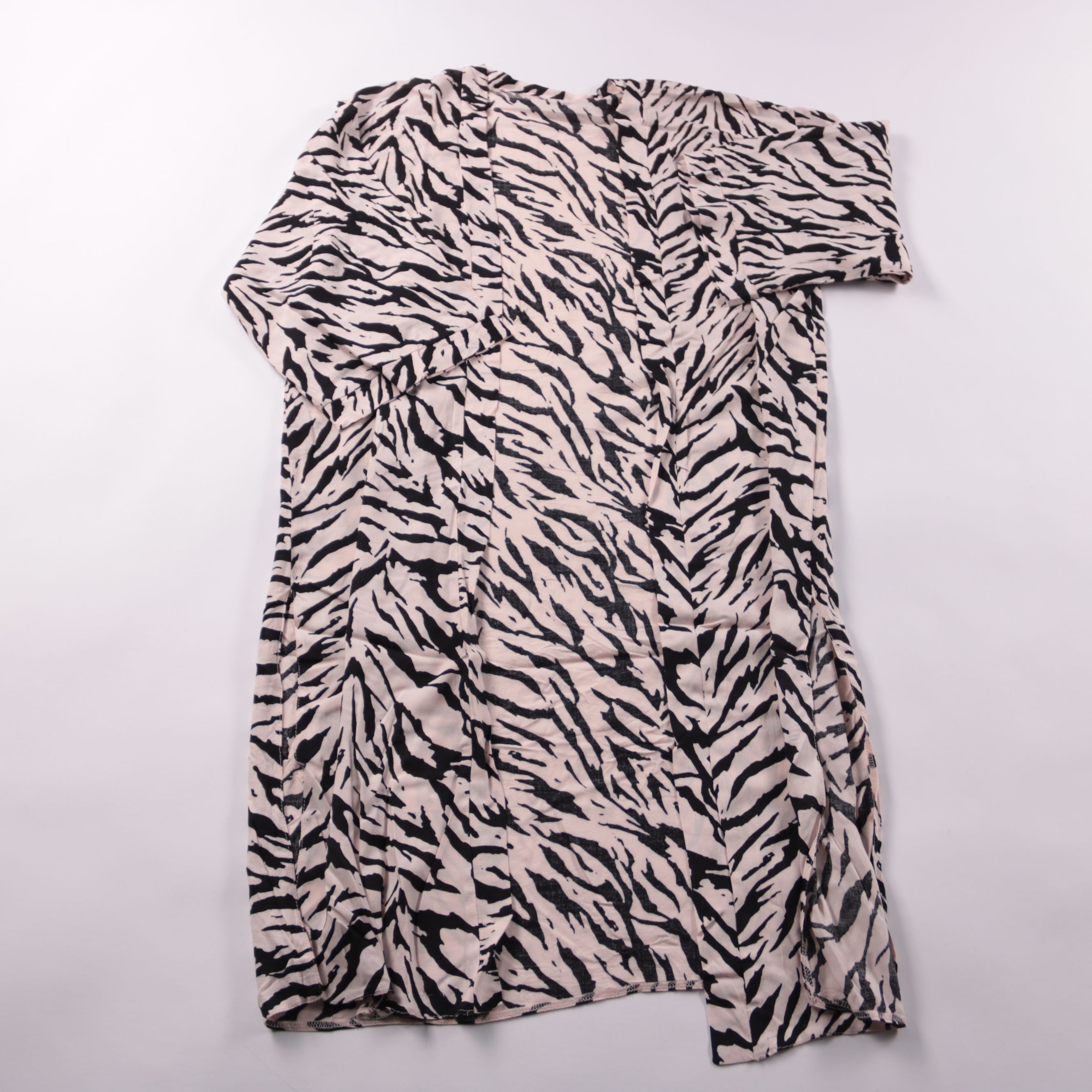 Женская блузка с анималистичным (зебра) принтом в чёрно-бежевой гамме. Подойдёт для повседневных образов и офиса в сочетании с однотонным низом. Лёгкая ткань и длинный рукав делают её удобной для носки и в помещении, и на улице.