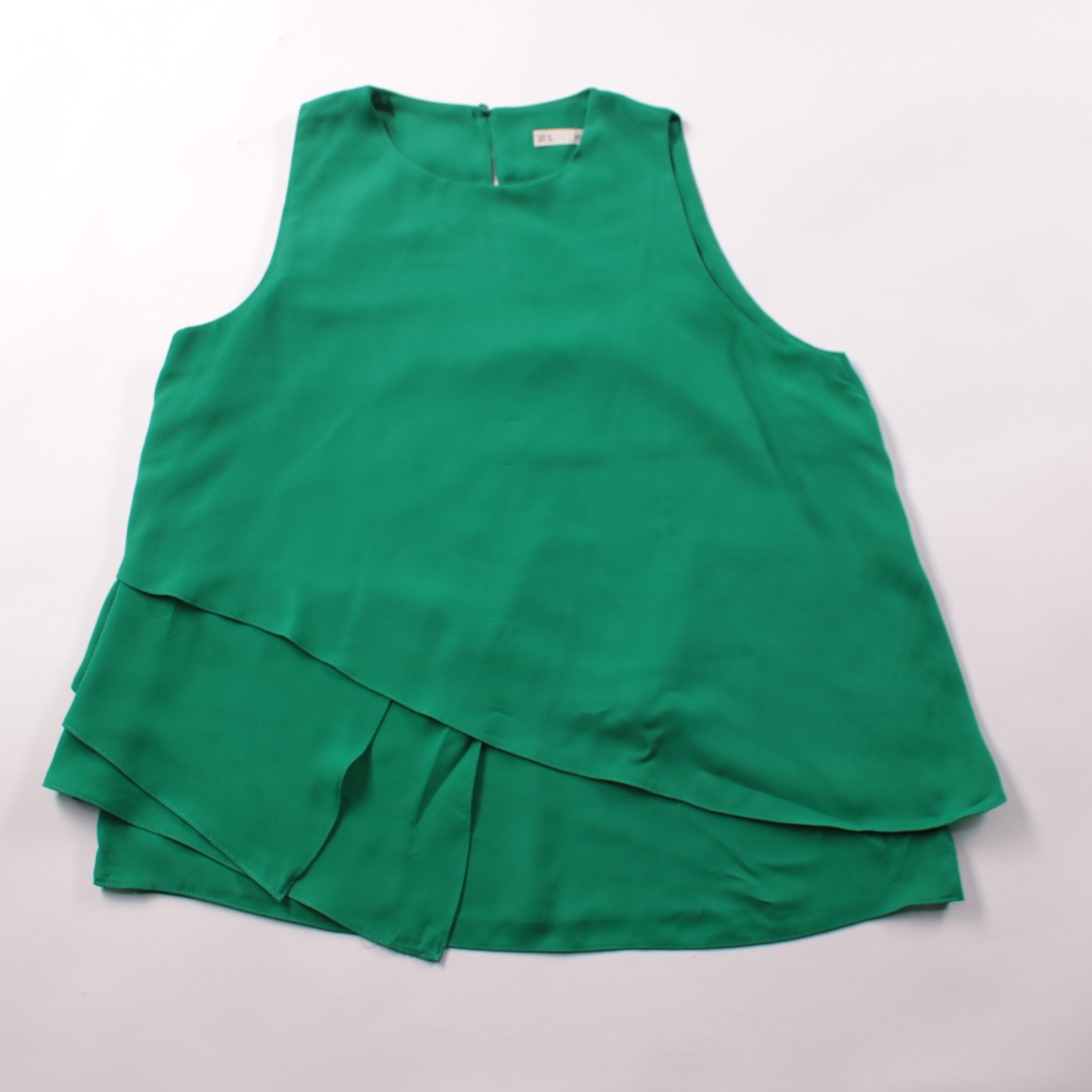 Зелёная блузка Sfera Basic без рукавов с округлым вырезом и многослойным асимметричным низом. Подойдёт для офиса и на выход, легко сочетается с брюками, юбкой или джинсами. Лёгкая ткань красиво драпируется и не стесняет движения.