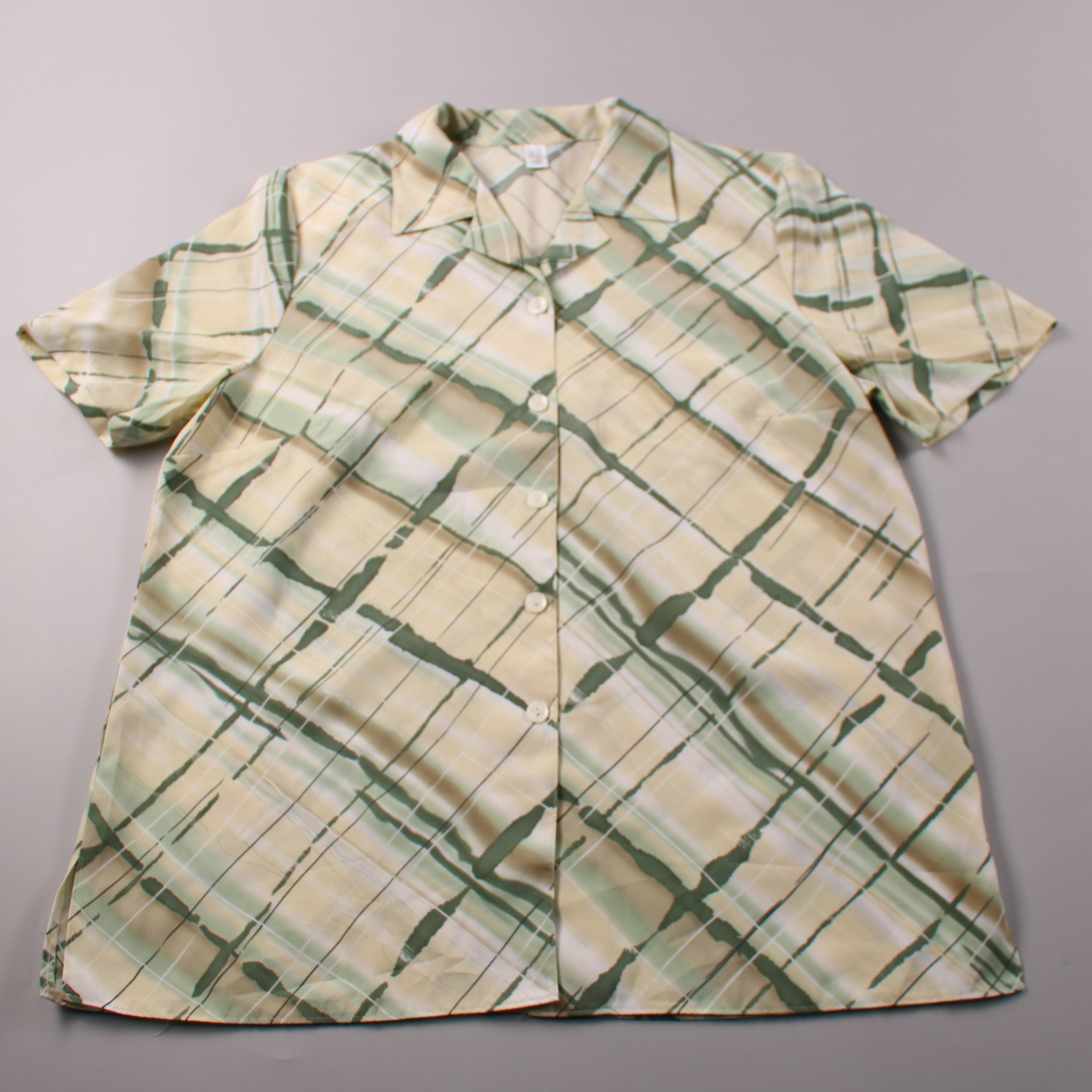 Лёгкая женская блузка с коротким рукавом и застёжкой на пуговицы, приятный зелёно-бежевый принт в клетку. Подойдёт для лета и тёплого офиса, хорошо сочетается с джинсами или однотонными брюками. Практичный плюс — ткань из полиэстера почти не мнётся и б...