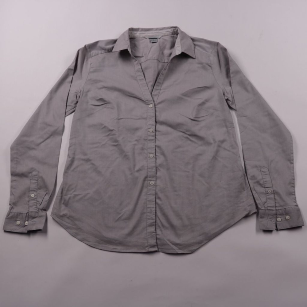 Женская рубашка H&M серого цвета, классическая модель на пуговицах с длинным рукавом и отложным воротником. Подойдёт для офиса и повседневных образов, легко сочетается с джинсами и брюками. Ткань с эластаном немного тянется и комфортна в носке.