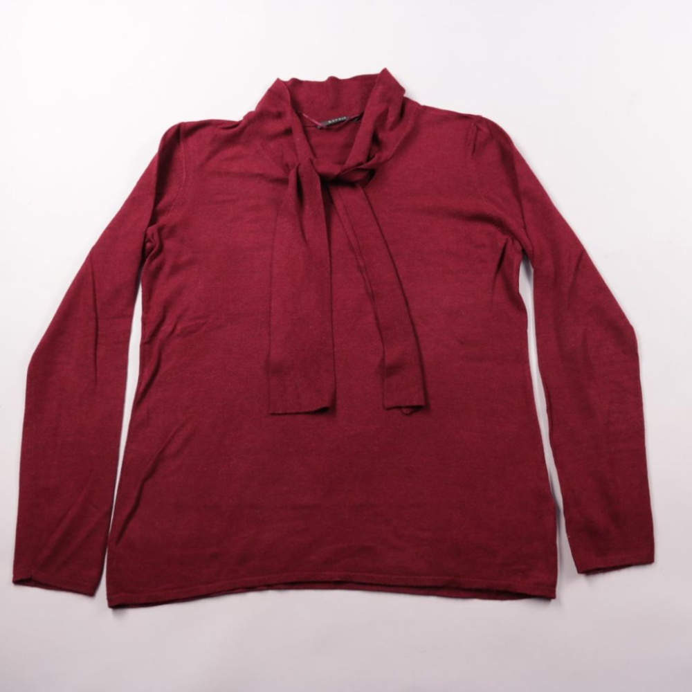Блузка Esprit бордового цвета с длинным рукавом и воротником-бантом. Подойдёт для офиса и повседневных образов, красиво смотрится с брюками и юбкой. Ткань мягкая и приятная к телу, не сковывает движения.