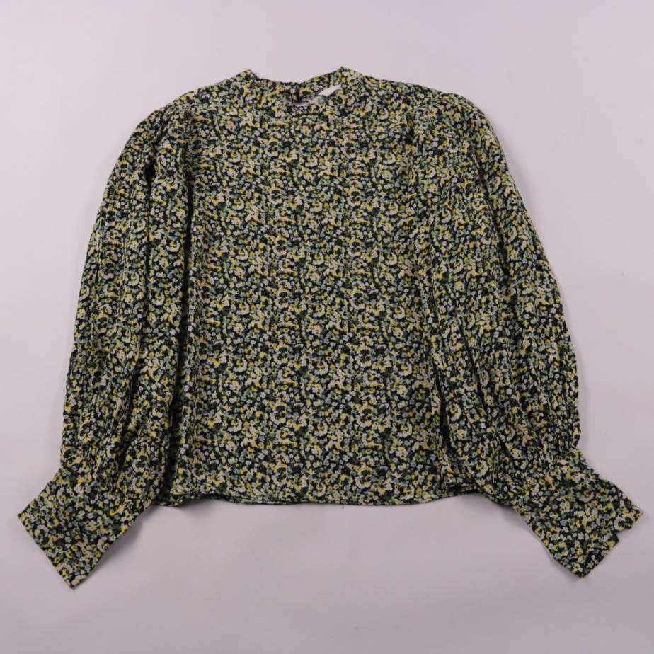 Женская блузка H&M с мелким цветочным принтом и лёгкими сборками на плечах, рукава длинные с манжетами. Подойдёт для офиса и на каждый день, легко сочетается с джинсами и юбками. Ткань 100% вискоза — хорошо дышит и комфортна в носке.