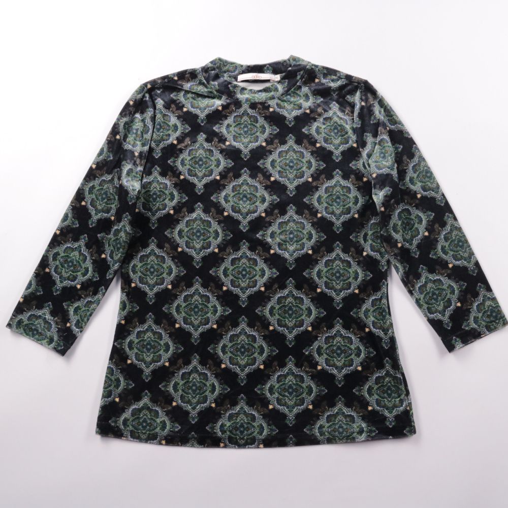Женская блузка Aiko из мягкого бархатистого трикотажа с орнаментальным принтом на чёрном фоне. Подойдёт для повседневных образов и офиса благодаря лаконичному крою и круглому вырезу. Материал слегка тянется и комфортно садится по фигуре.