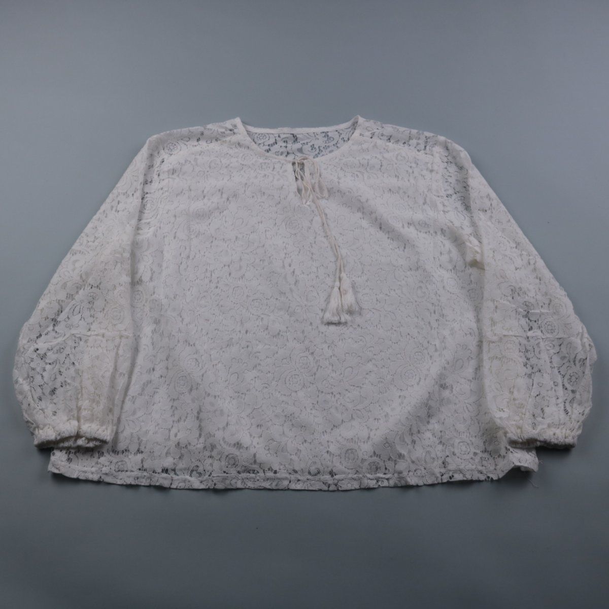 Женская белая кружевная блузка с длинным рукавом и завязками с кисточками у горловины. Подойдёт для повседневных и более нарядных образов, хорошо сочетается с джинсами и юбками. Лёгкая ткань практически не мнётся и быстро сохнет.