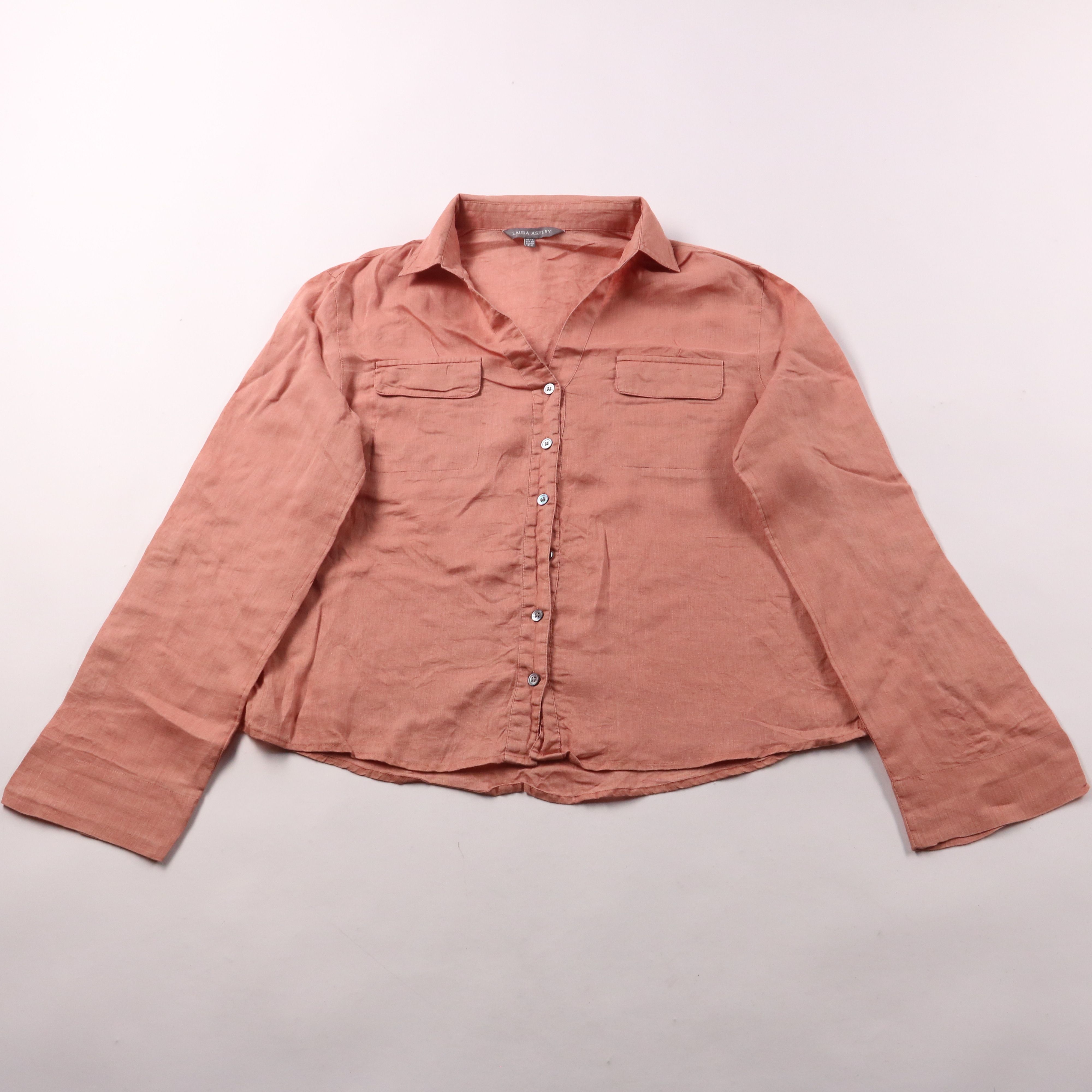 Женская льняная рубашка Laura Ashley пыльно-розового оттенка с отложным воротником и застёжкой на пуговицы, есть накладные карманы на груди. Подойдёт для лета и тёплой погоды, хорошо сочетается с джинсами и брюками. Лён дышит и комфортен в носке.